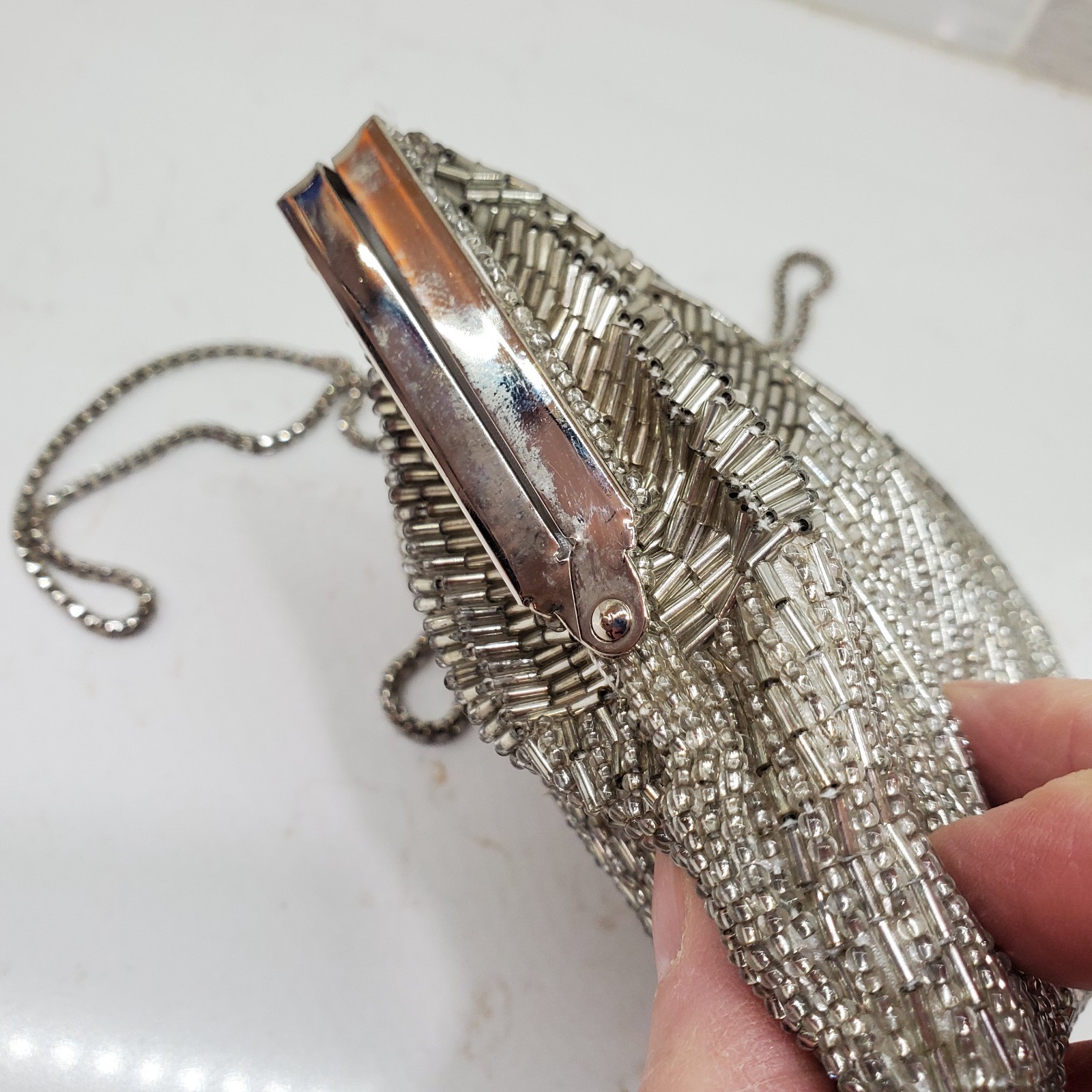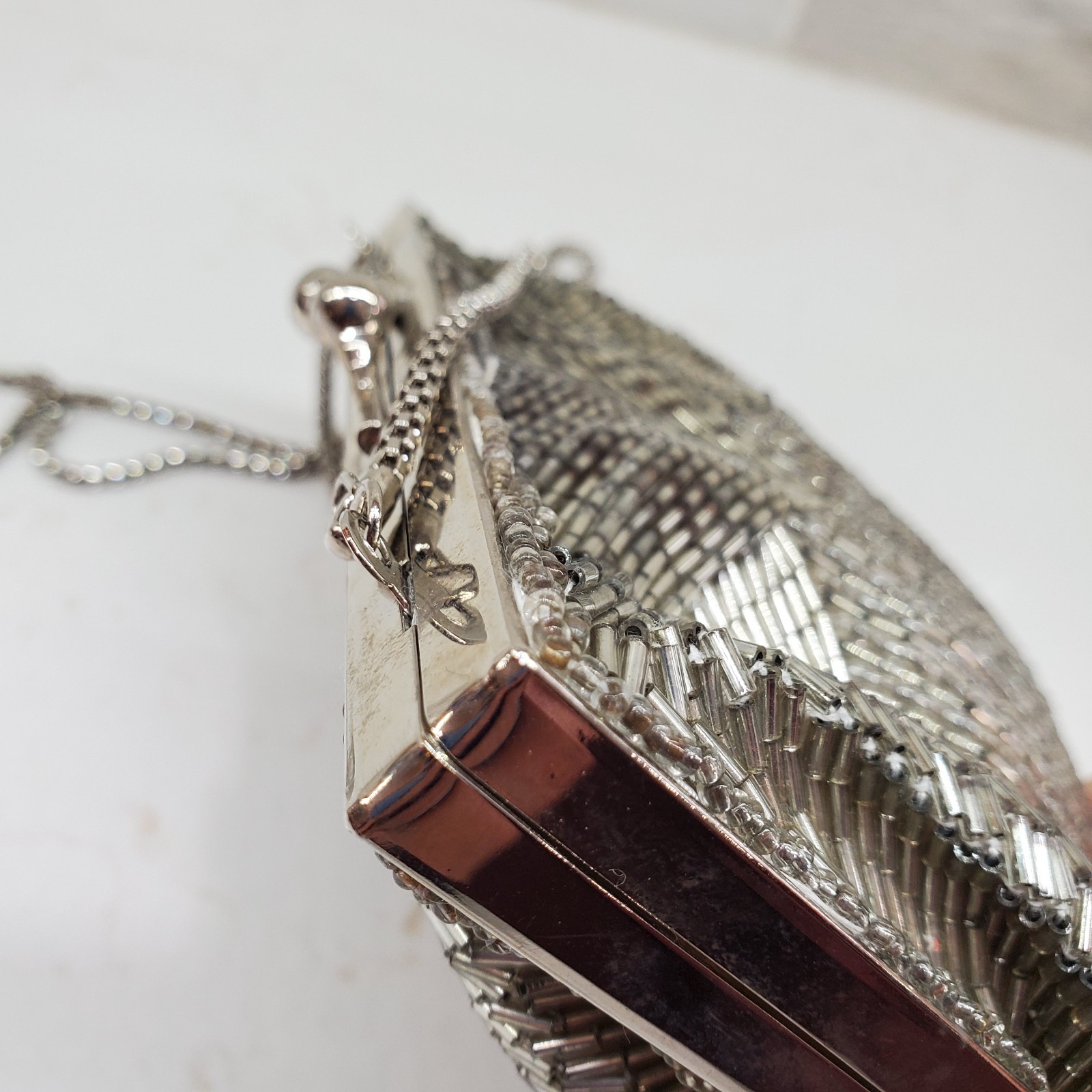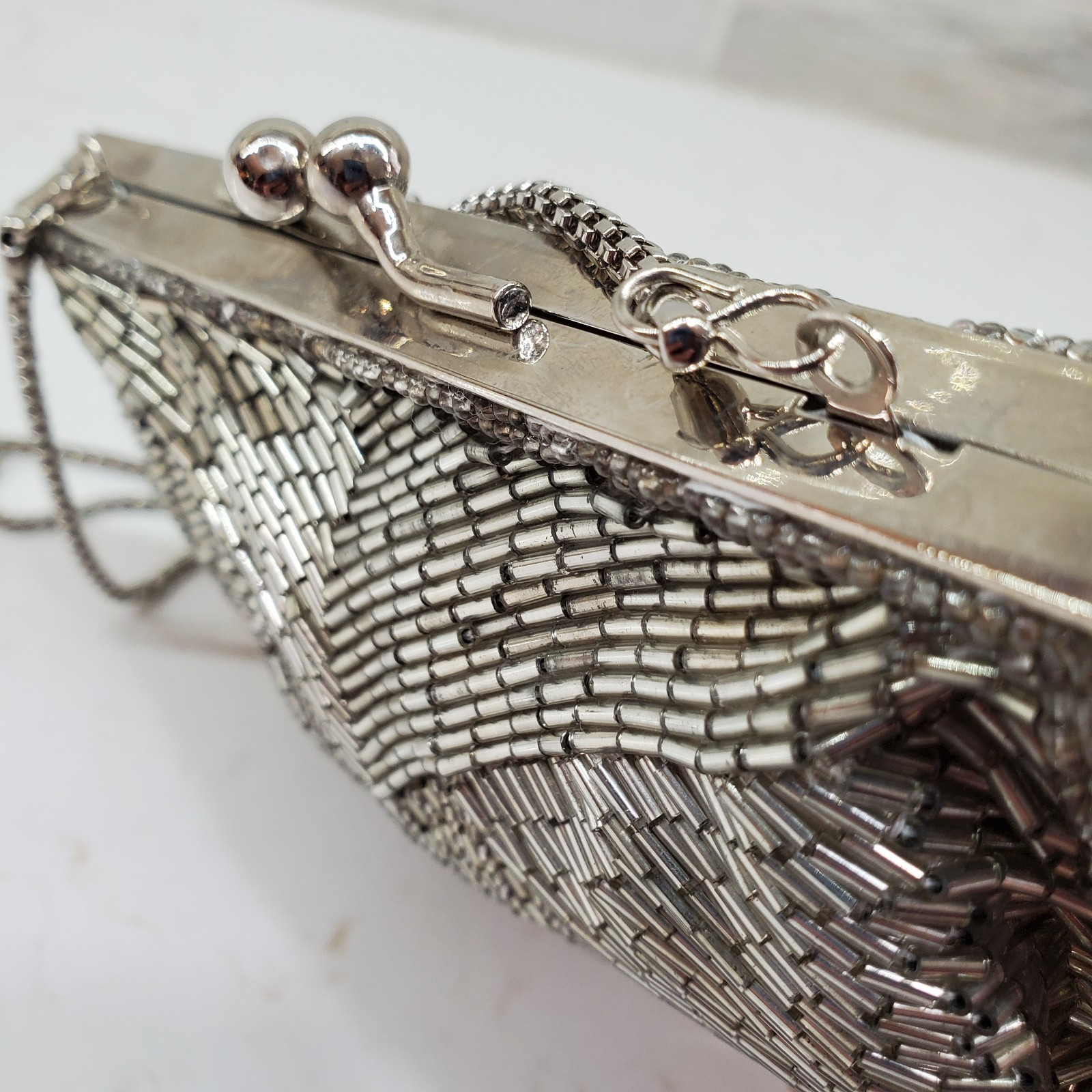 как выглядит Luxury MAGID Silver Bugle Beaded Evening Bag Snake Chain Strap White Lining фото