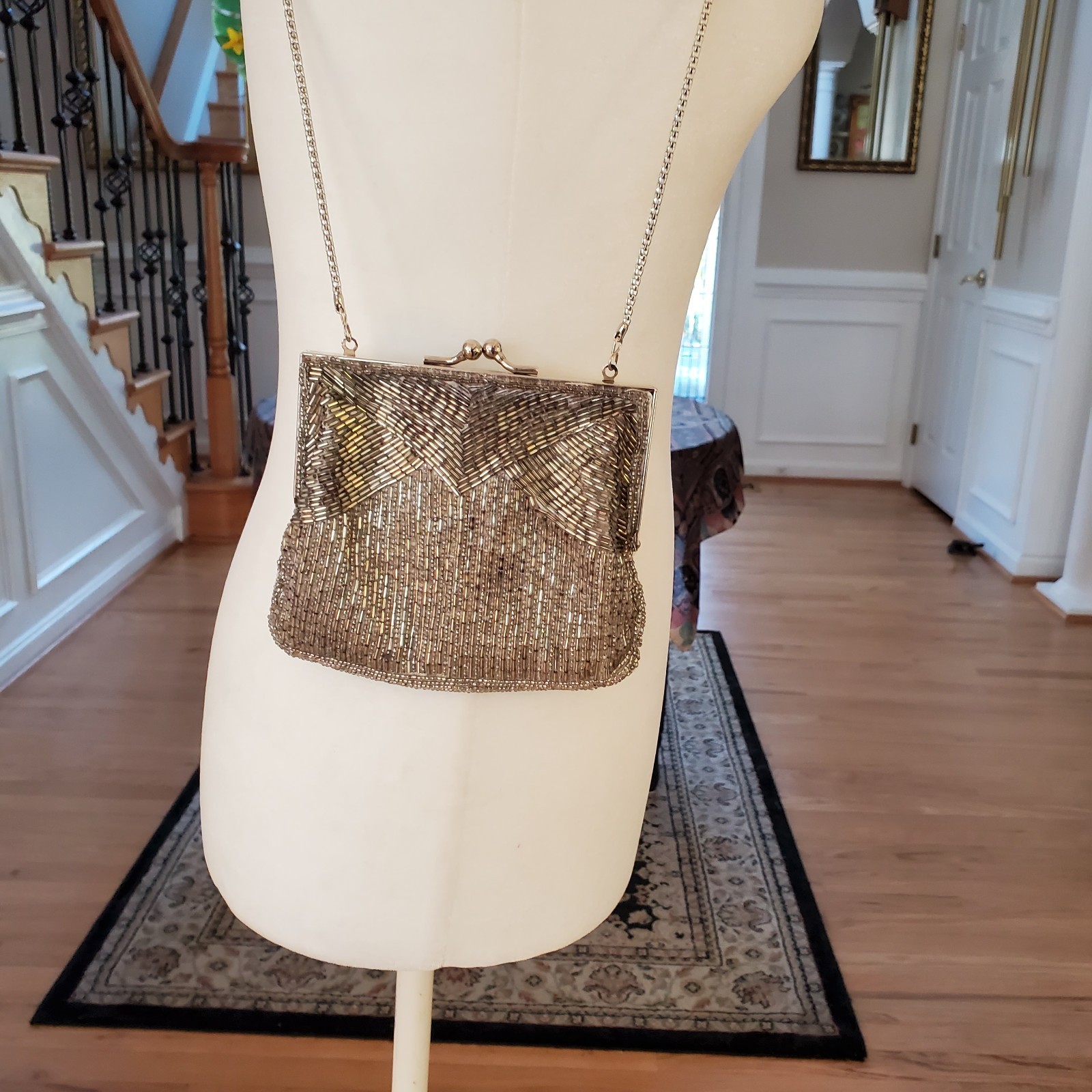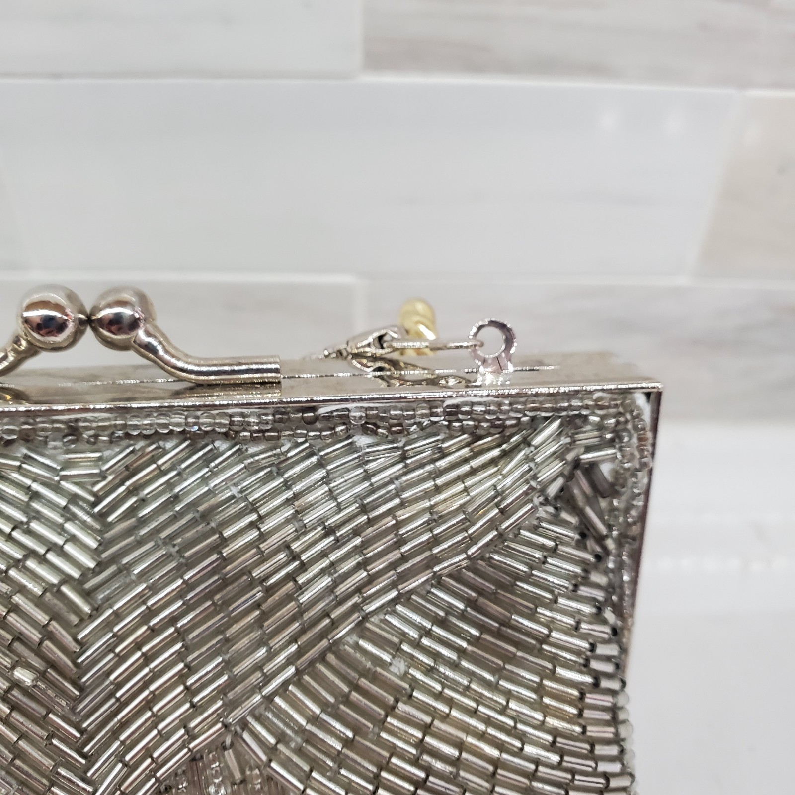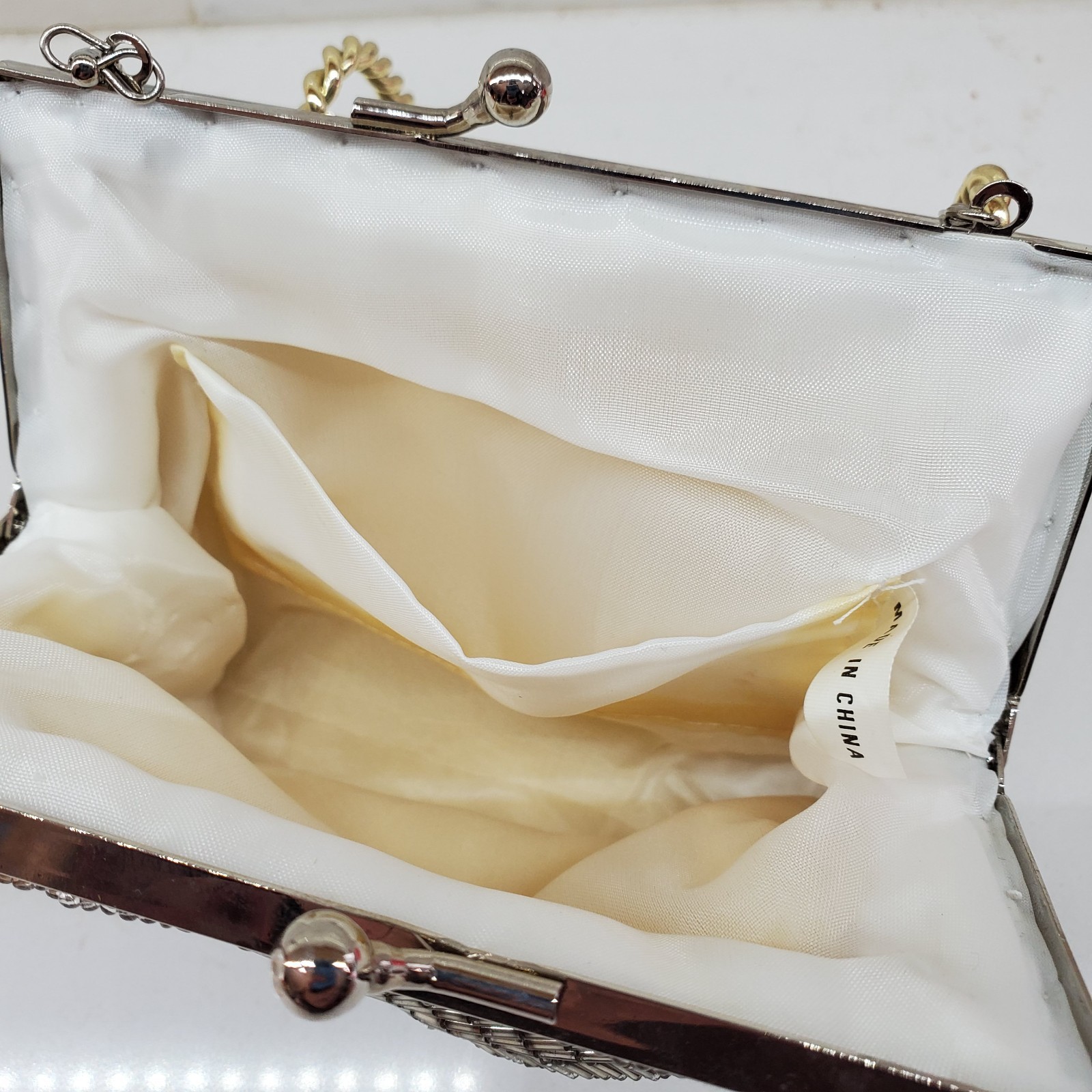 как выглядит Luxury MAGID Silver Bugle Beaded Evening Bag Snake Chain Strap White Lining фото