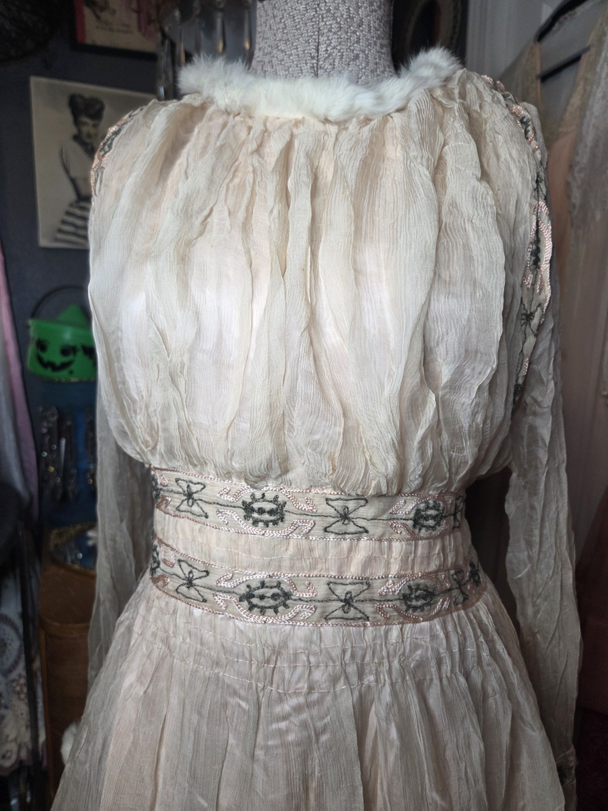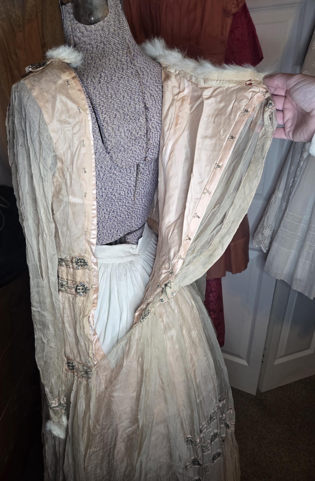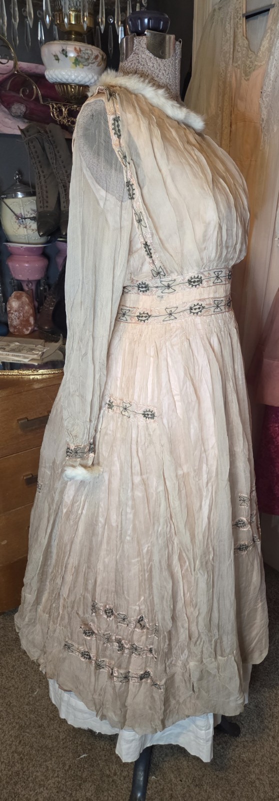 Pink Edwardian Chiffon Evening Gown w/ Beautiful Beadwork White Fur Trim