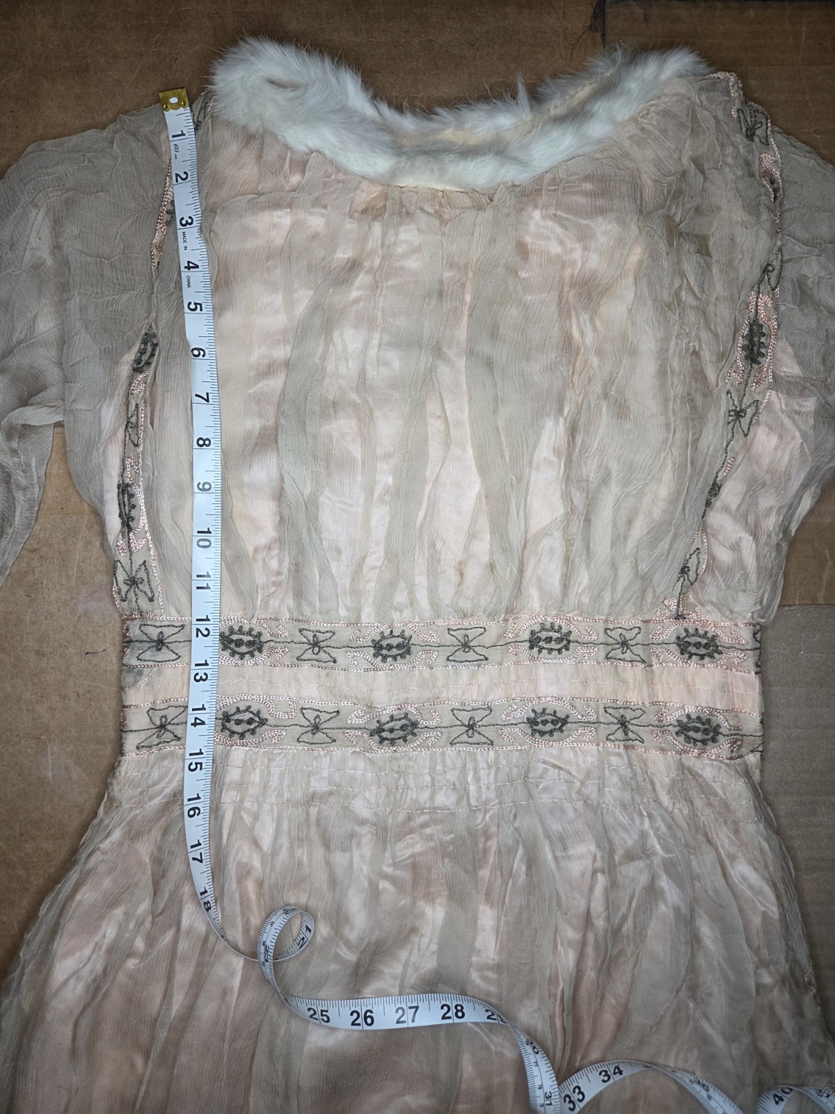 как выглядит Pink Edwardian Chiffon Evening Gown w/ Beautiful Beadwork White Fur Trim фото