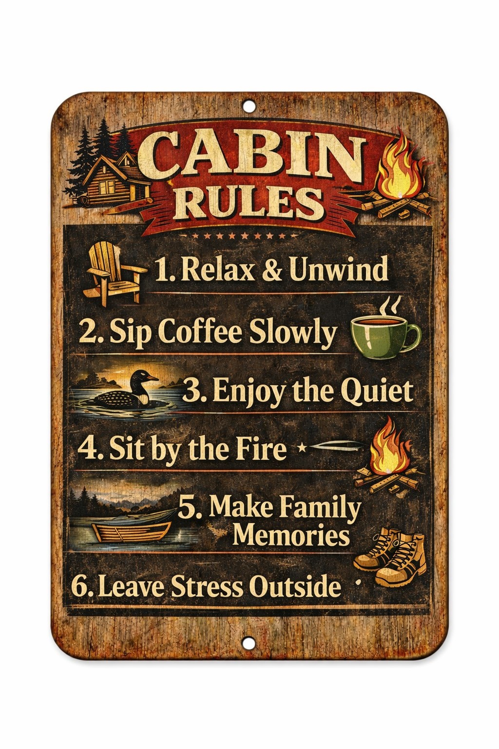 Cabin Rules Metal Sign Rustic Lake House Decor 8x12 Campfire Lodge Camping