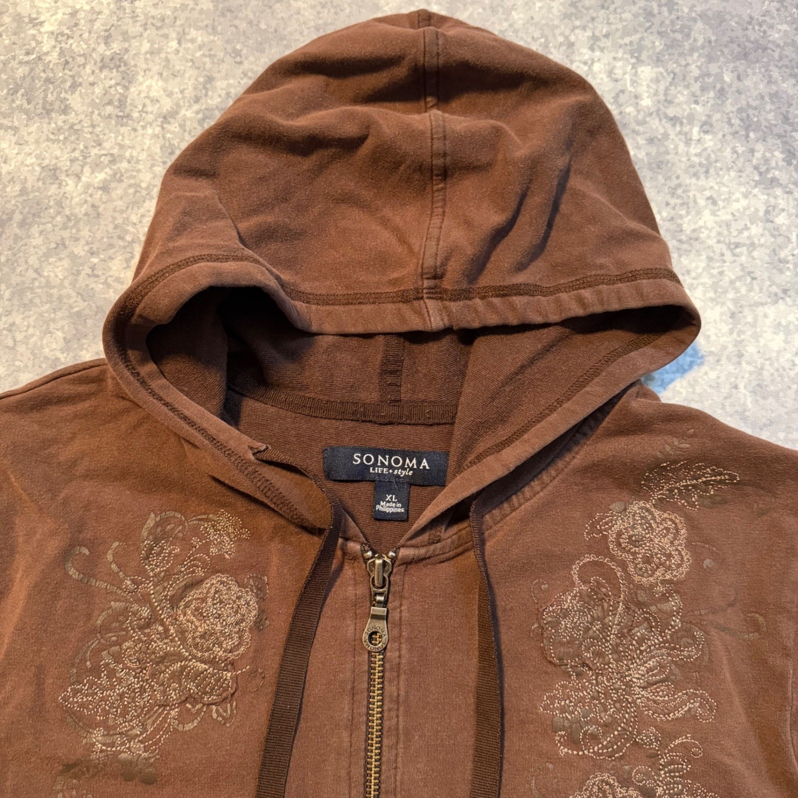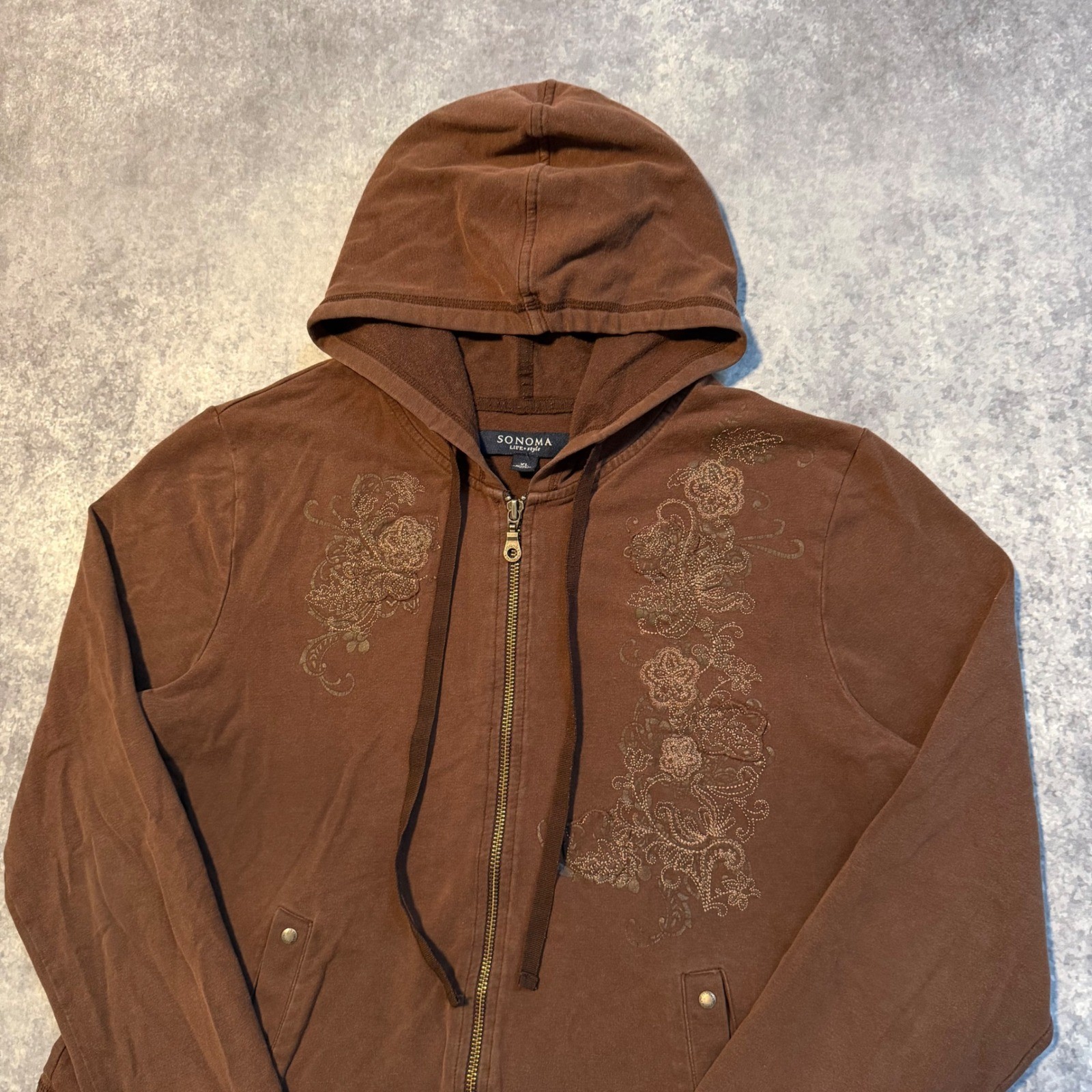 Sonoma Life Style Womens XL Brown Floral Embroidered Full Zip Hoodie Y2K