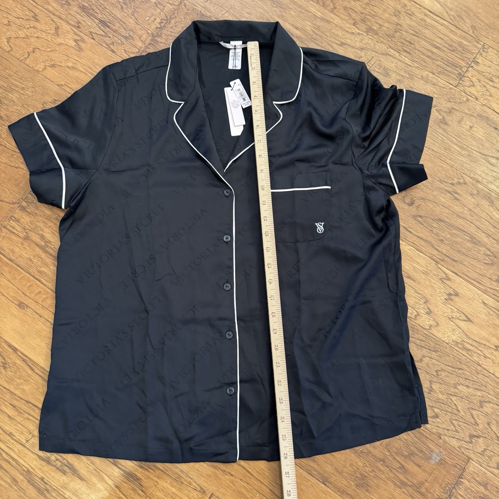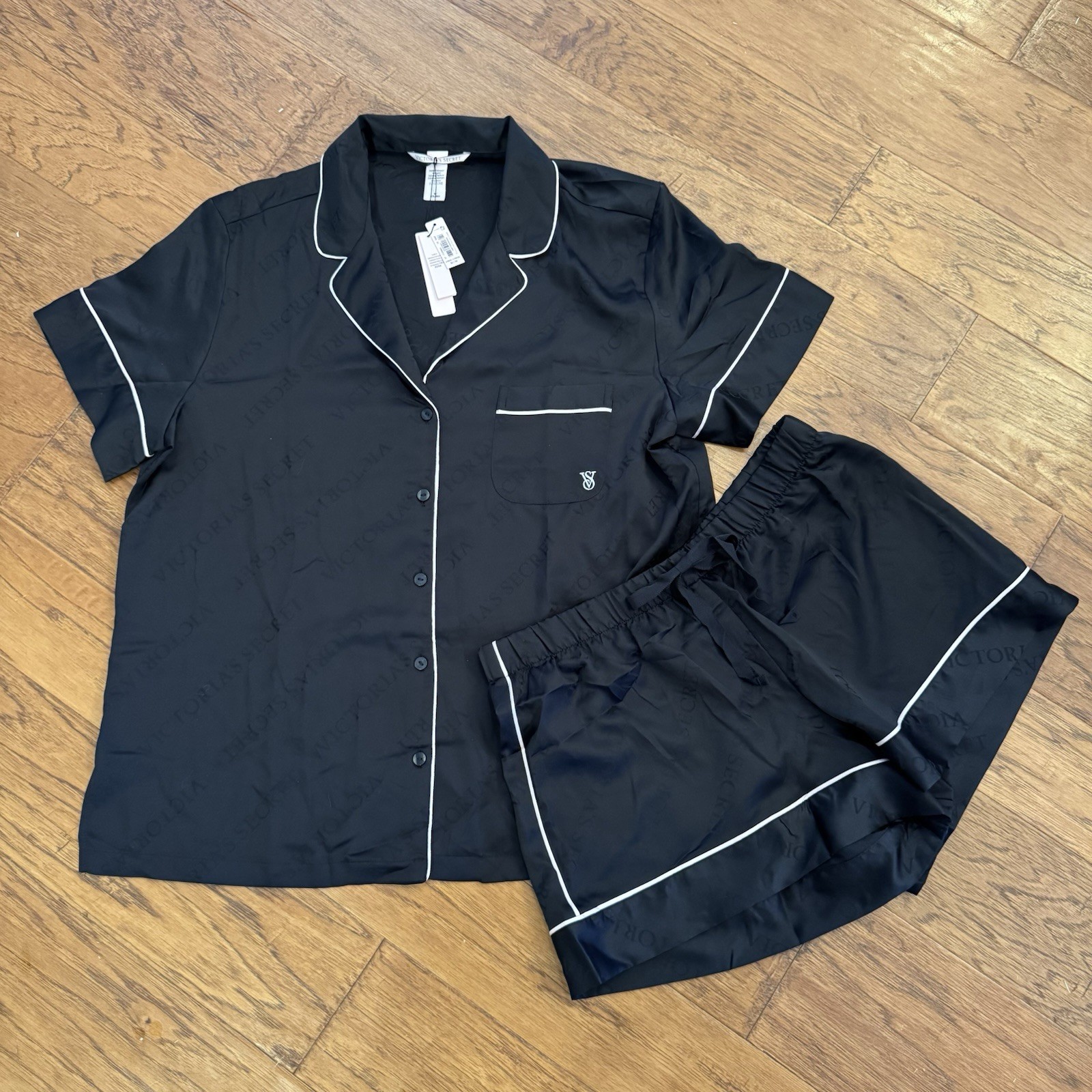 Victoria's Secret Black Satin Short Pajama Set with White Piping Trim MED NWT
