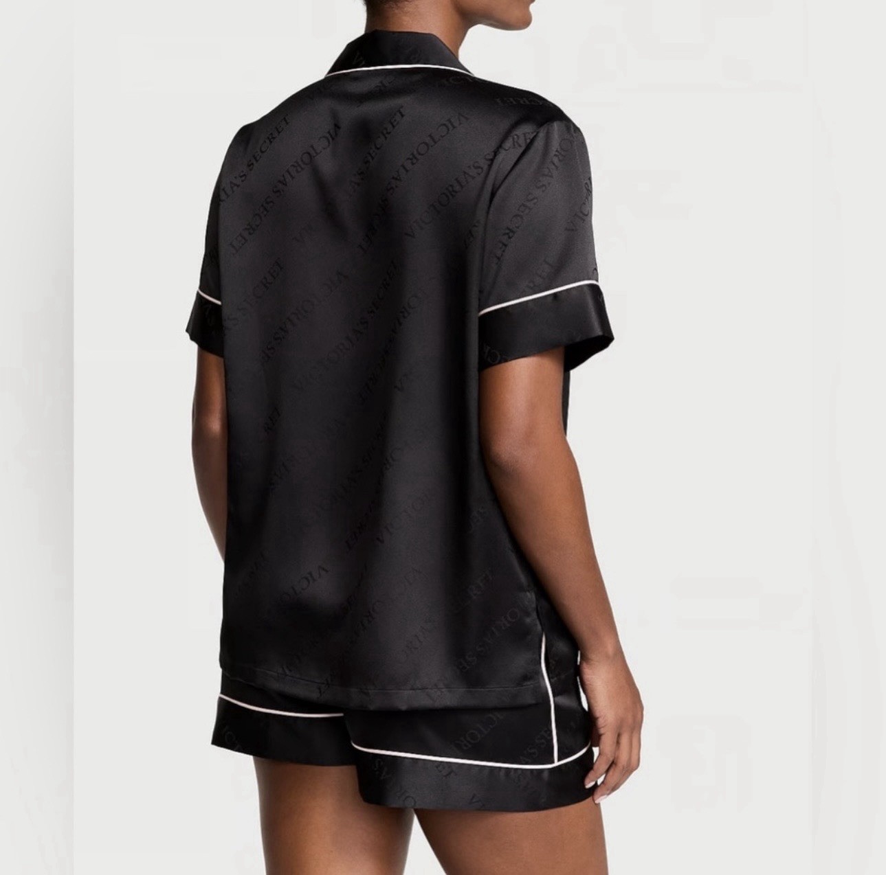 как выглядит Victorias Secret Black Satin Short Pajama Set with White Piping Trim MED NWT фото