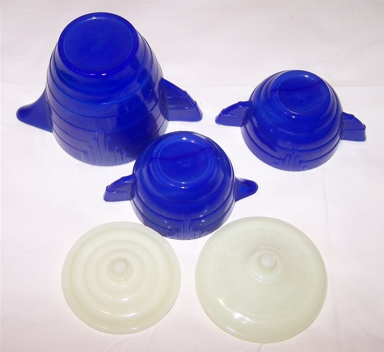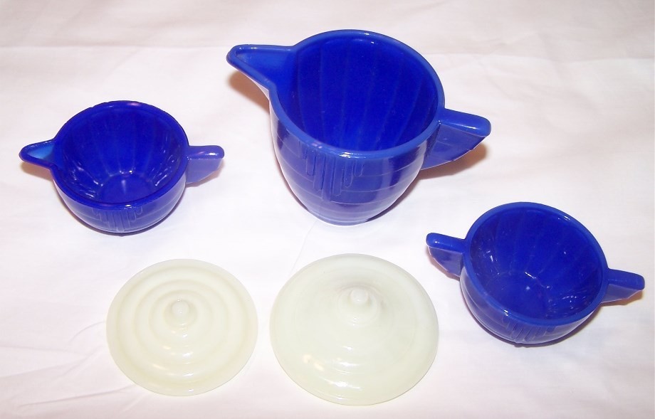 Akro Agate American Maid 3 Piece Blue Tea Set with Glowing Lids
