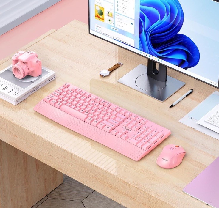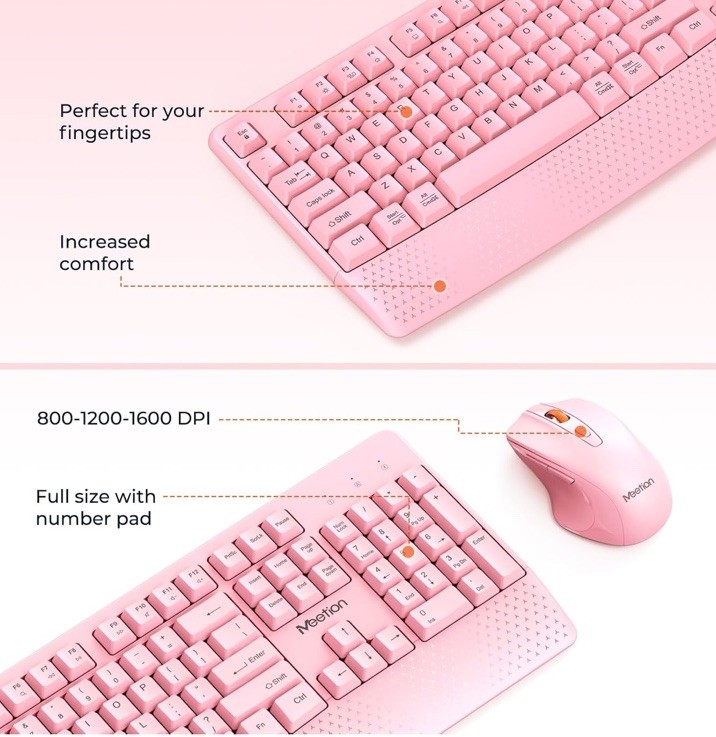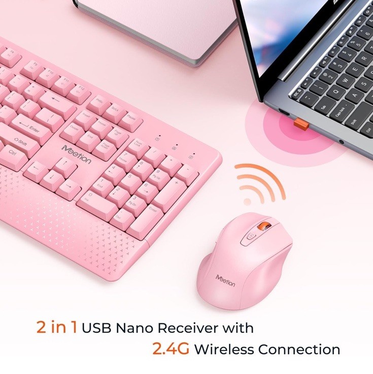 Meetion Pink Wireless Keyboard and Mouse Bundle Full Size QWERTY Nano 1600 DPI