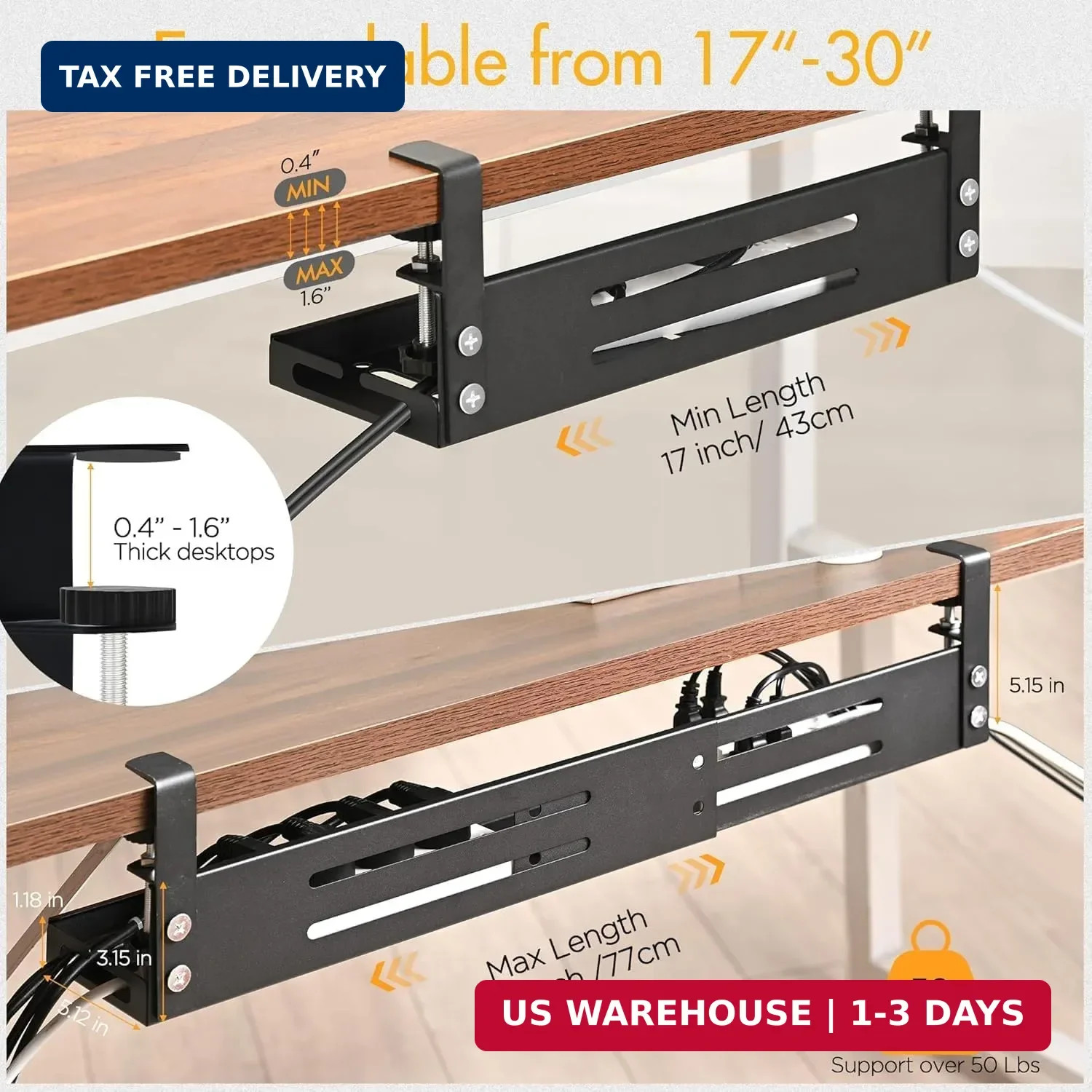 No Drill Under Desk Cable Management Tray, 17-30 Retractable Cord Organizer fo