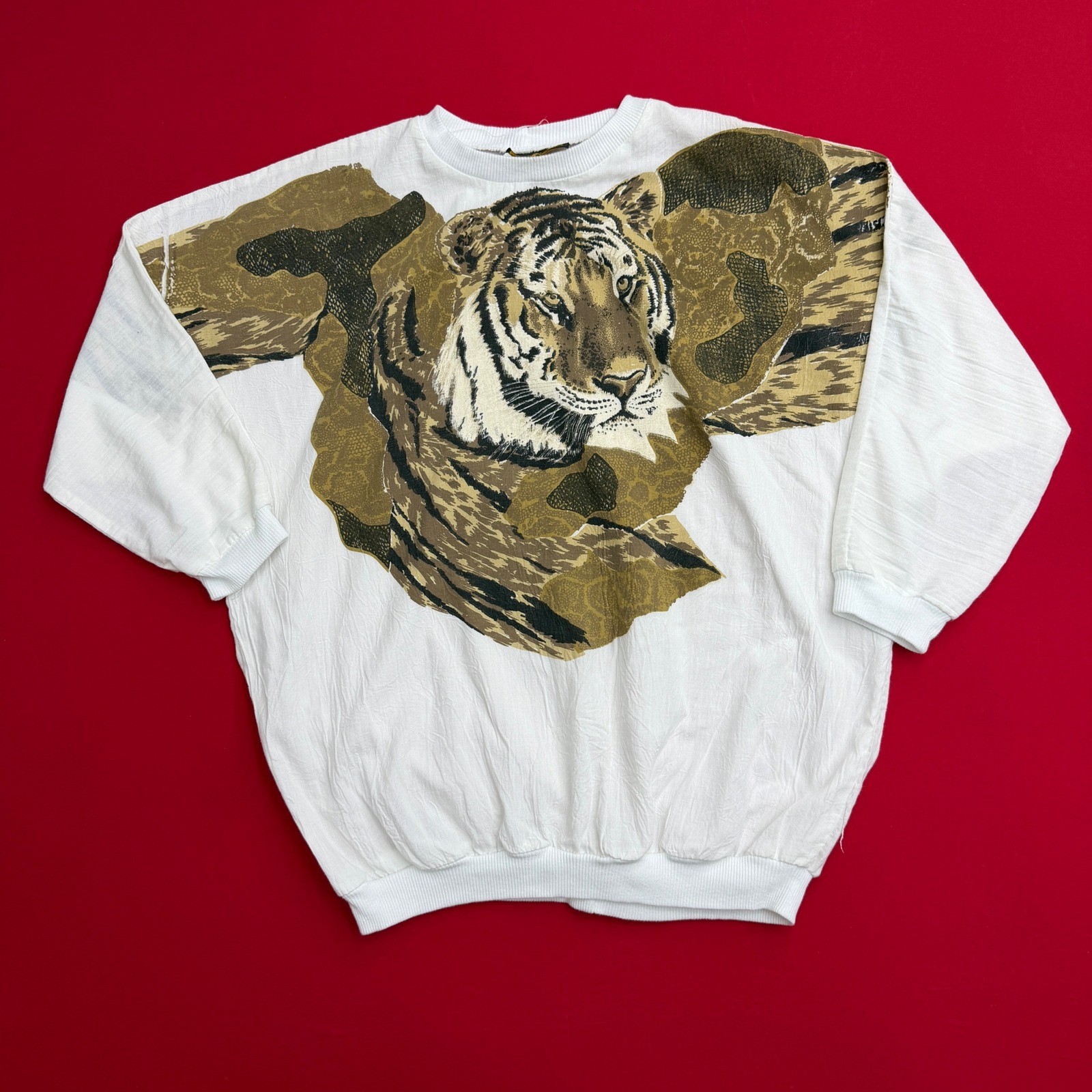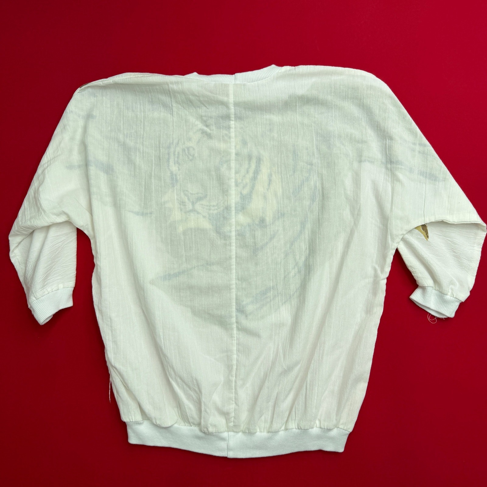 VTG 90's Collegiana Tiger Graphic Sweatshirt White Textured Pullover Made in USA