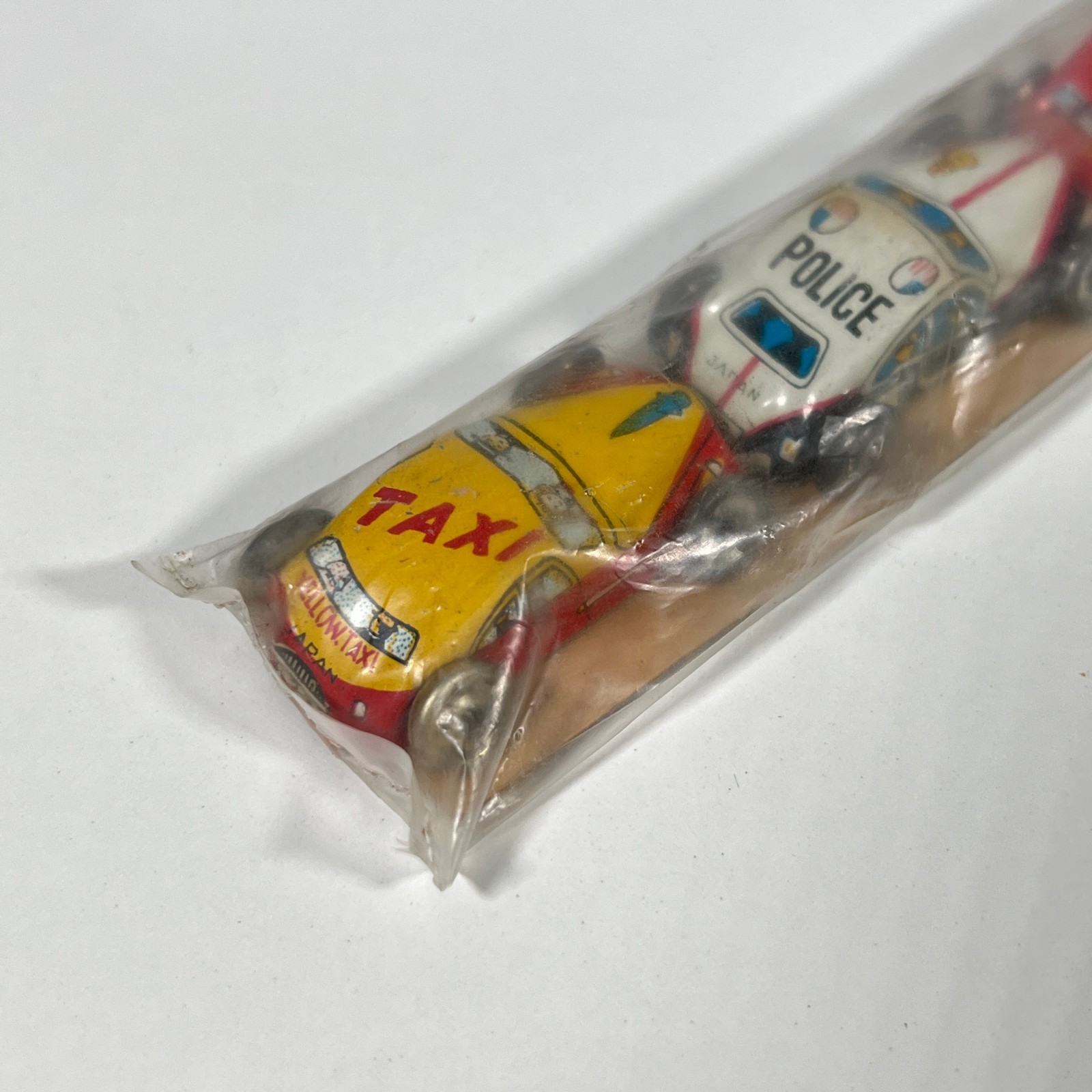 Vintage Motor Car Japan Tin Litho 4pc Set Ambulance Police Fire Chief Sealed