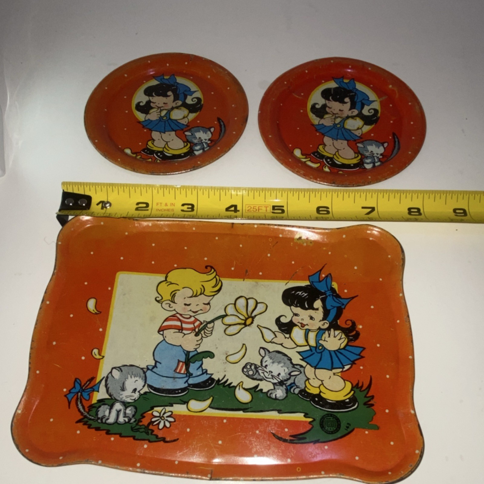 Vintage 1940's-50's Ohio Art Tin Litho Tea Set Girl Boy Cat 3pc