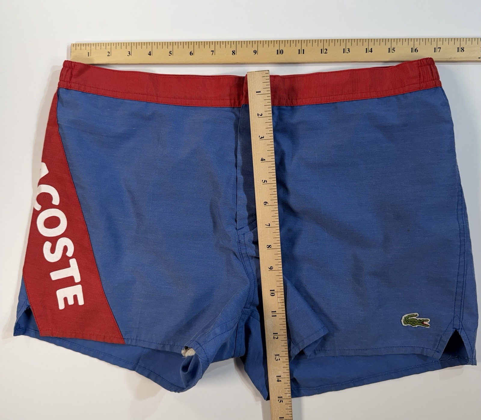 Lacoste Swim Trunks Mens 46 Blue Red Colorblock Croc Logo Shorts VTG