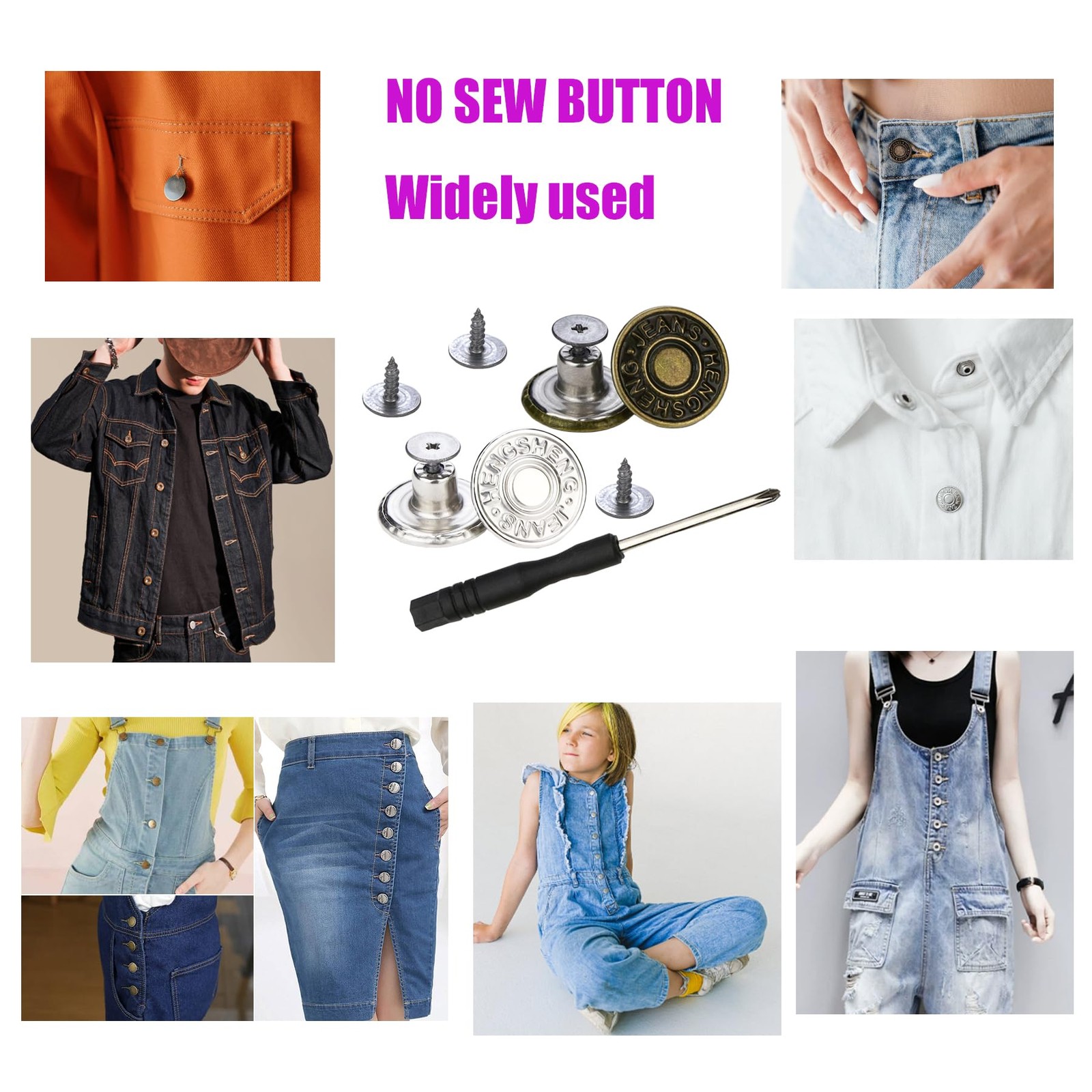 20 Pcs Button for Sewing Metal Jeans, 17 mm No-Sew Nailess Removable Metal Je...