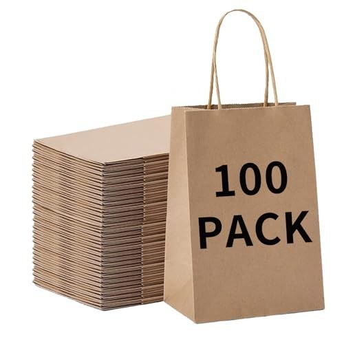 100 Pcs Medium Brown Kraft Paper Gift Bags with Handles - 8.25x4.3x10.6 Inch for
