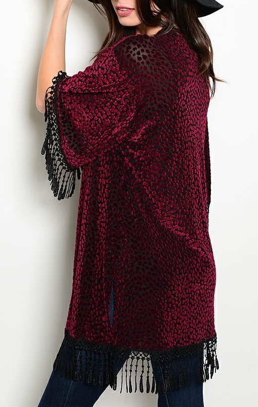 Leopard Flocked Burnout Fringe Trim 3/4 Sleeve Open Front Tunic Cardigan Cover