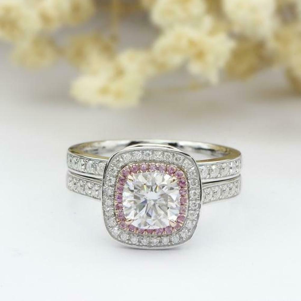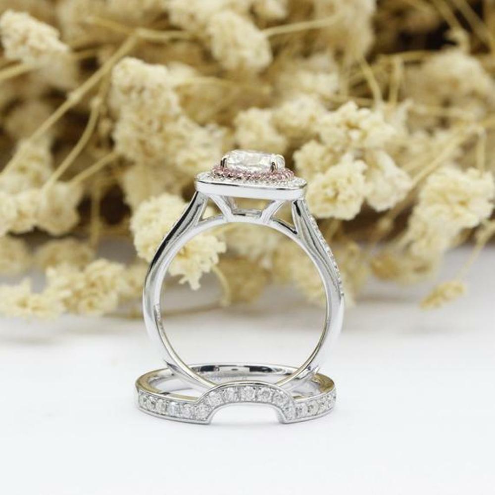 как выглядит 2.45ct Cushion White Pink CZ Double Halo Engagement Ring Set 925 Silver фото