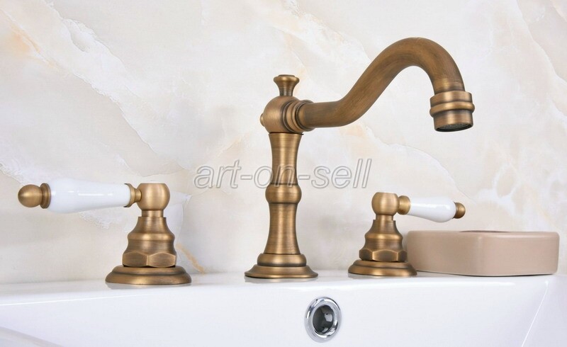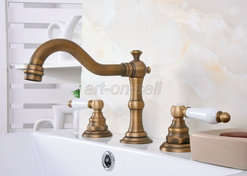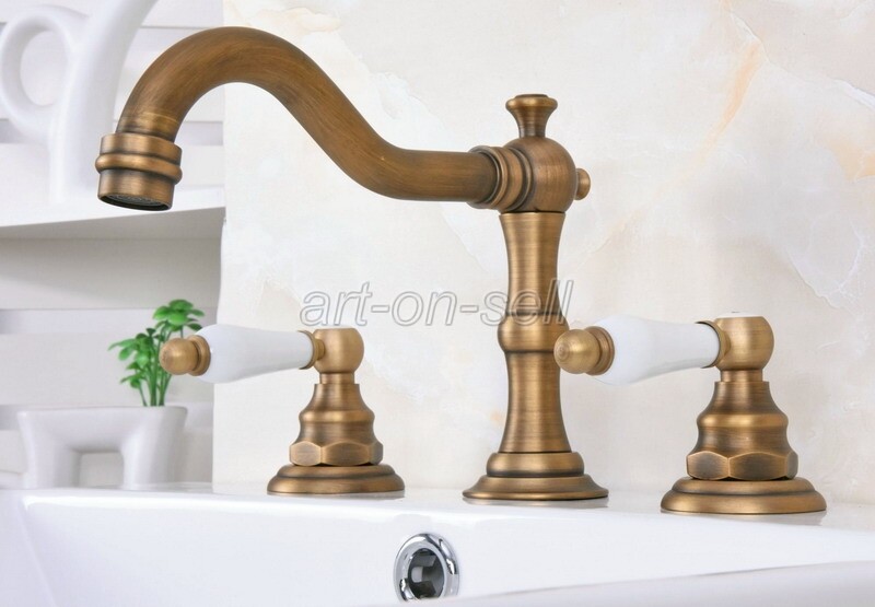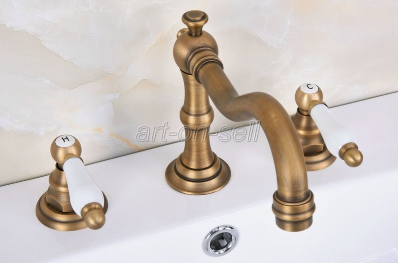 как выглядит Widespread Bathroom Sink Faucet 3 Holes Two Handles Antique Brass Mixer Tap фото