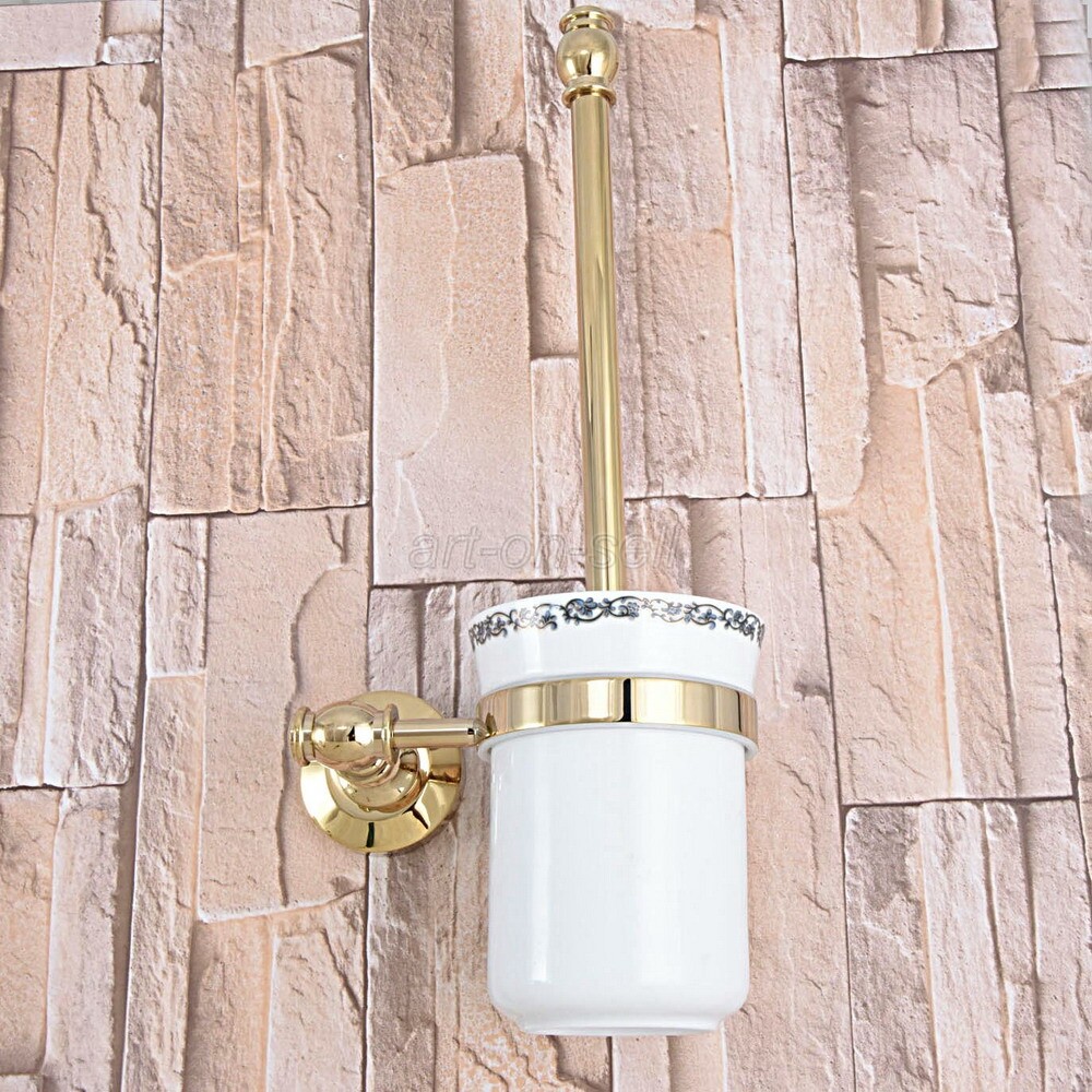Gold Color Brass Toilet Brush Set Holder Brush Ceramic Cup Wall Mounted aba314