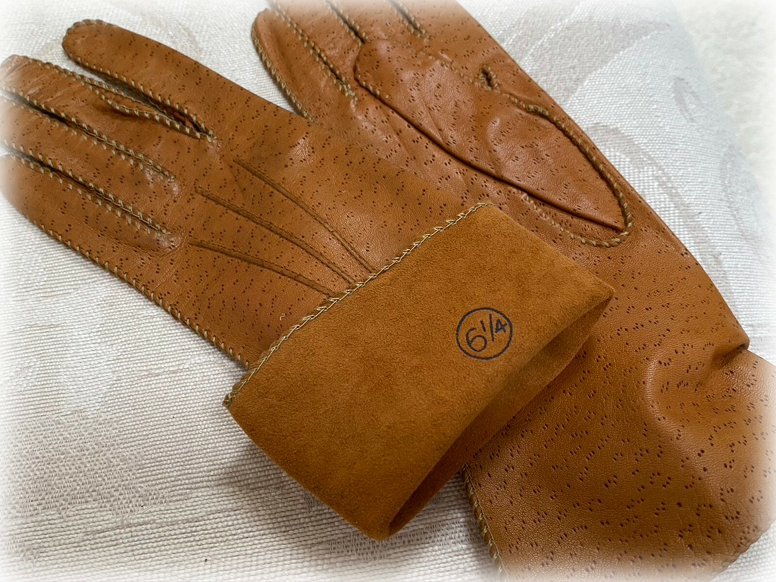 Vtg Cinnamon Brown Leather Over Wrist GLOVES Pin Pricked Design Size 6 1/4