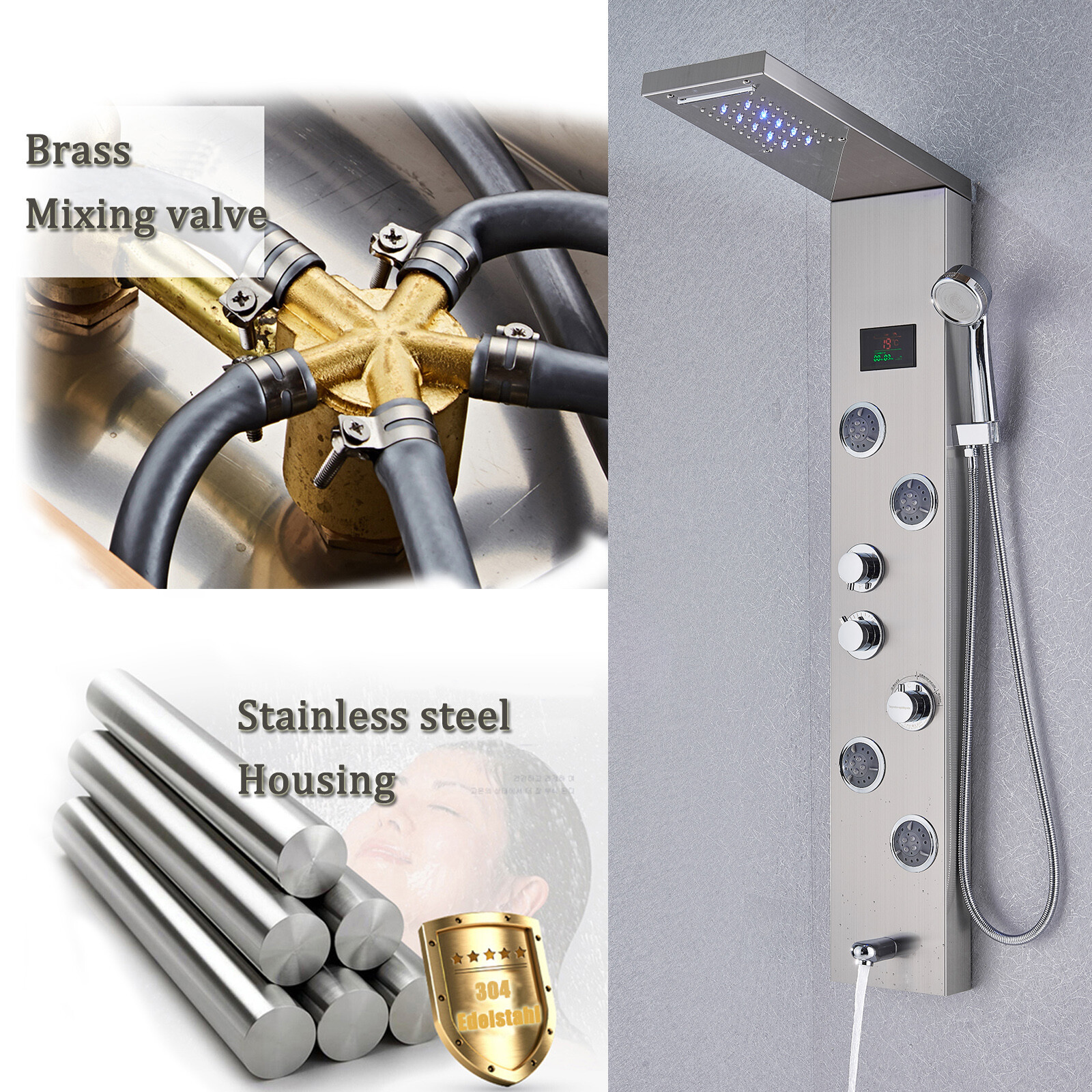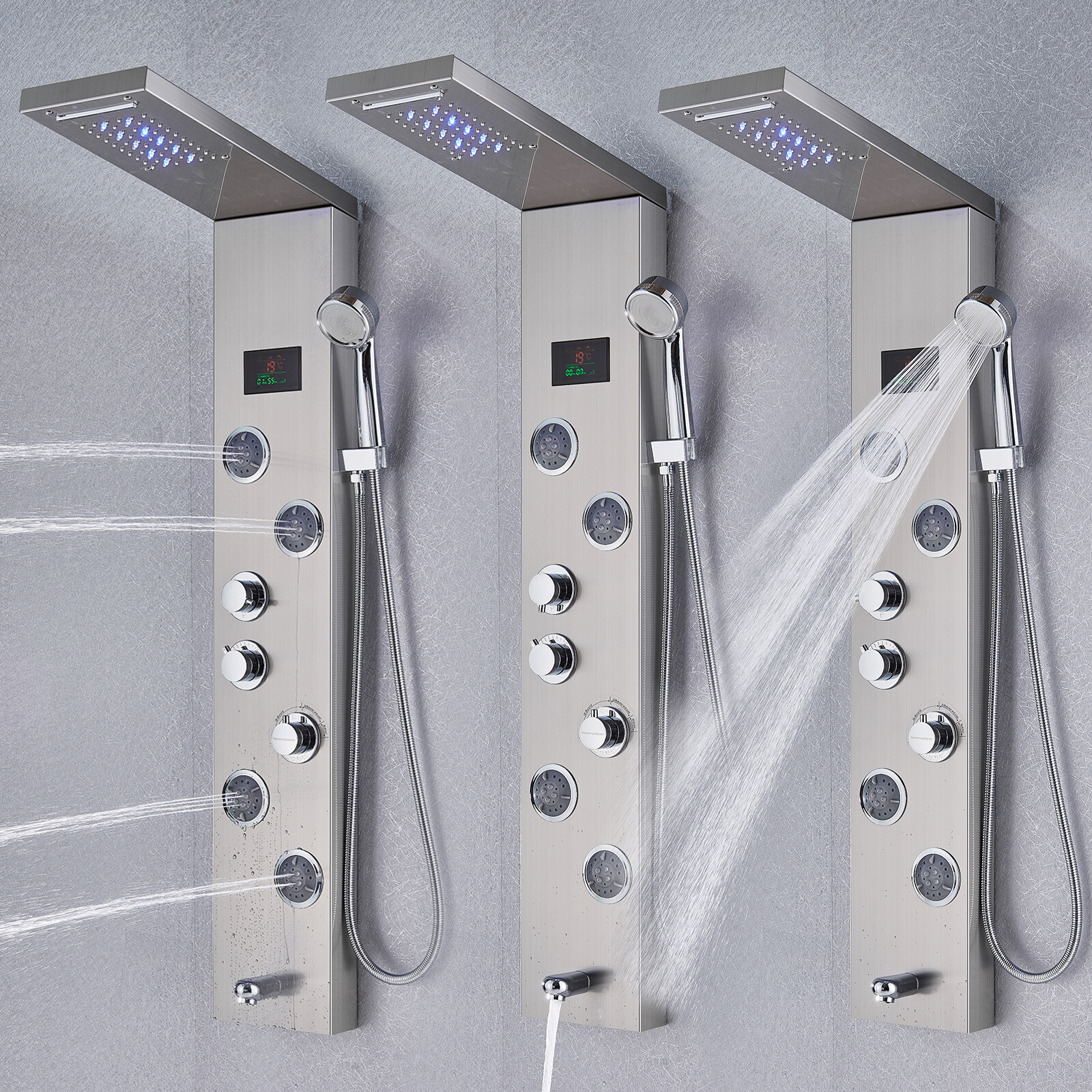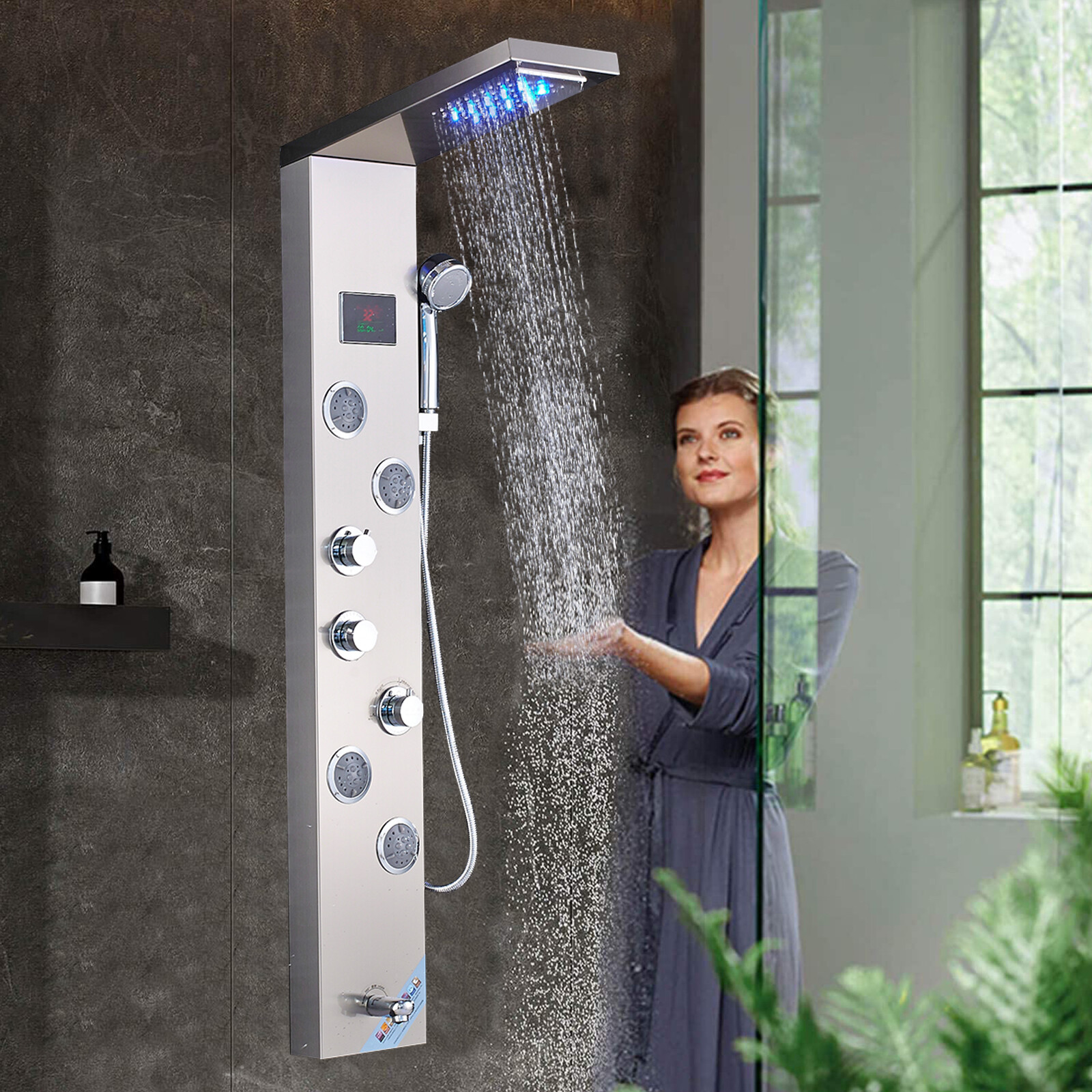 LED Shower Panel Tower Faucet Stainless steel Rain Head System Massage Jets Taps