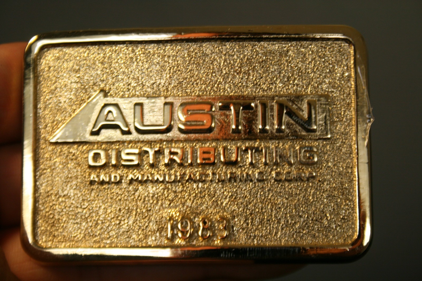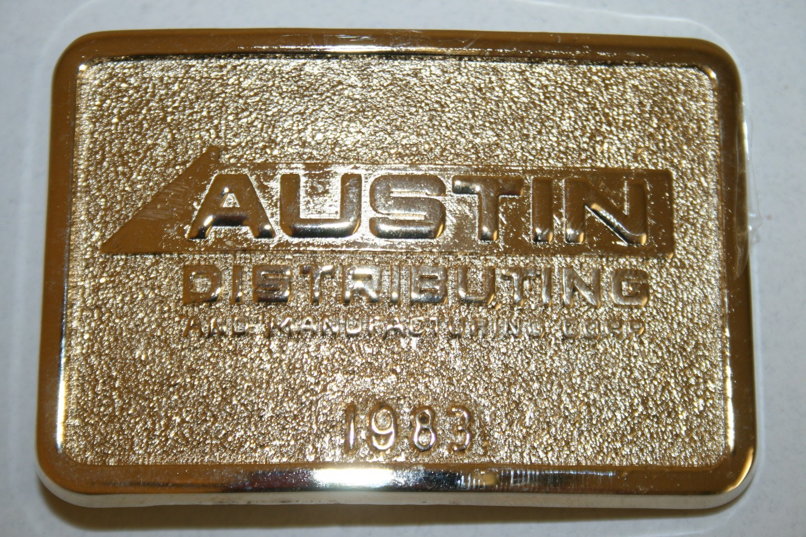 Vintage 1983 Golden AUSTIN Distributing Manufacturing Metal Belt Buckle Rare