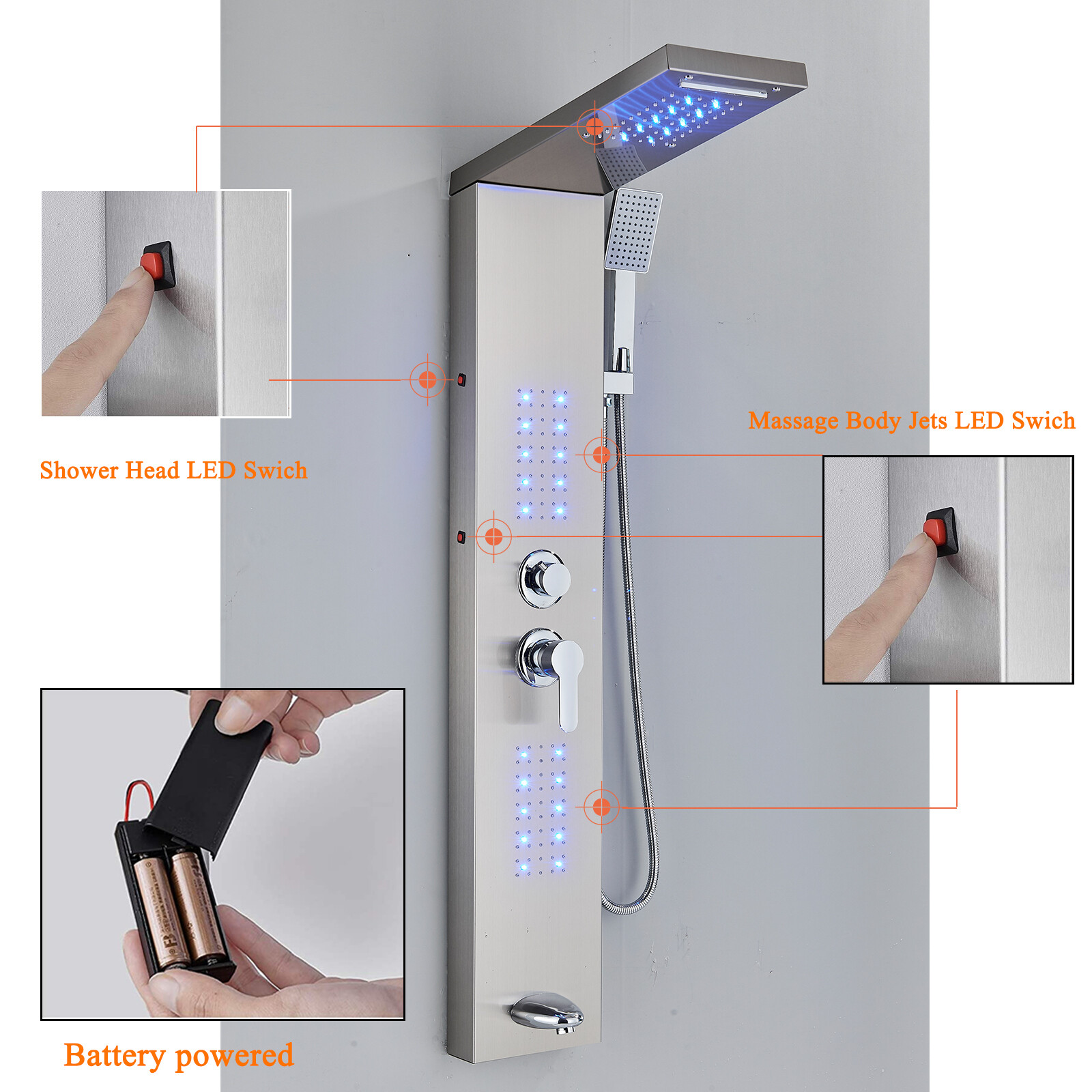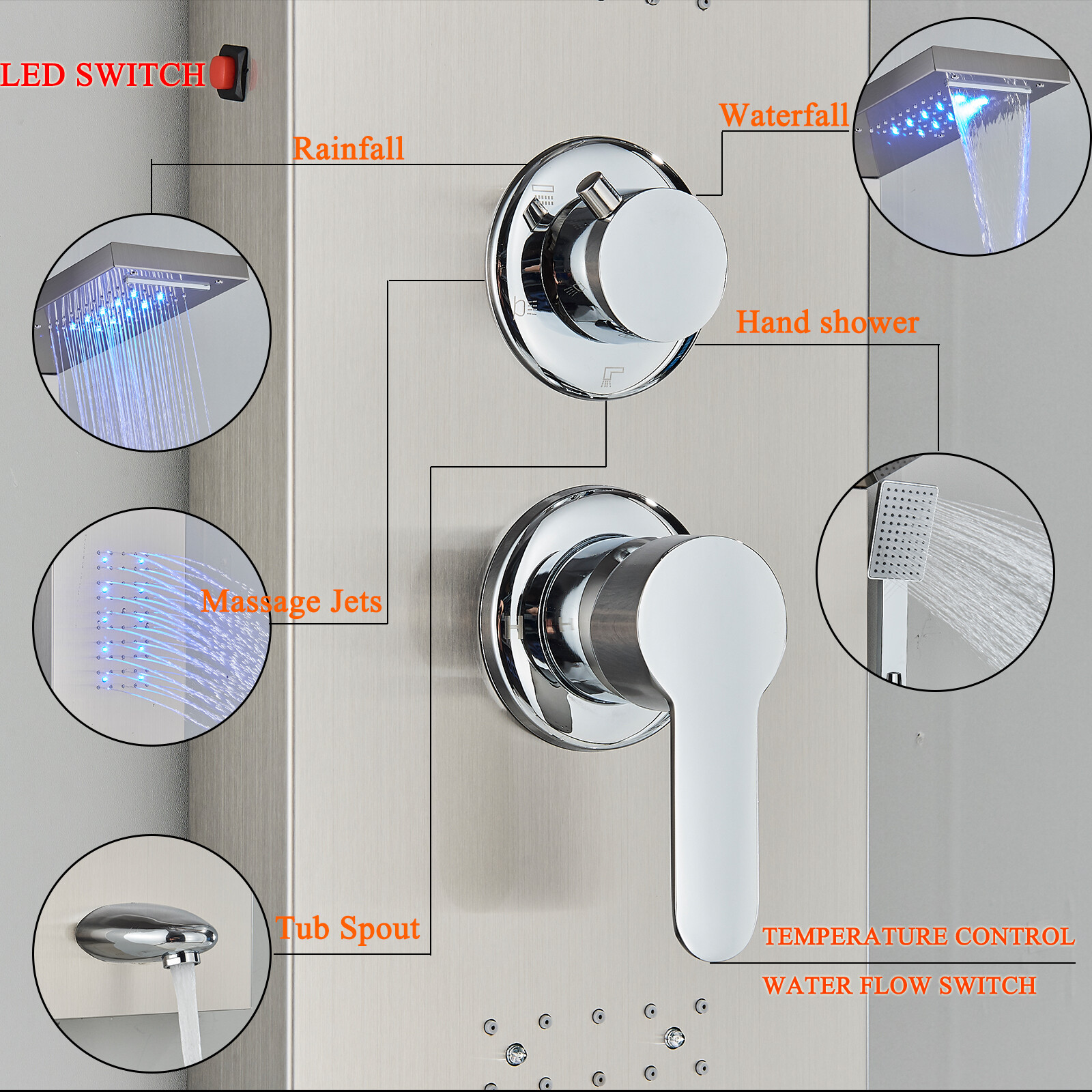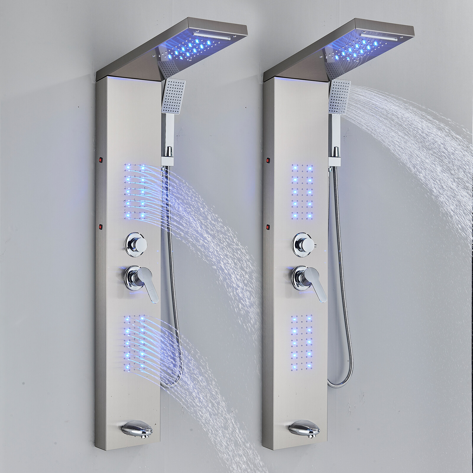 Stainless Steel Shower Panel Tower System LED Rain Waterfall Massage Jet Sprayer