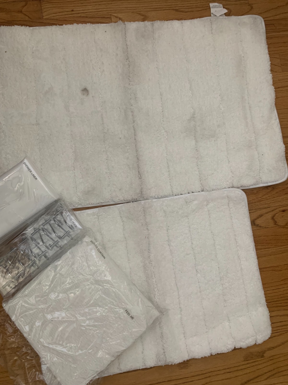 USED Nueva Spa 5pc Bath Set: textured shower curtain, liner,hooks, rugs, White