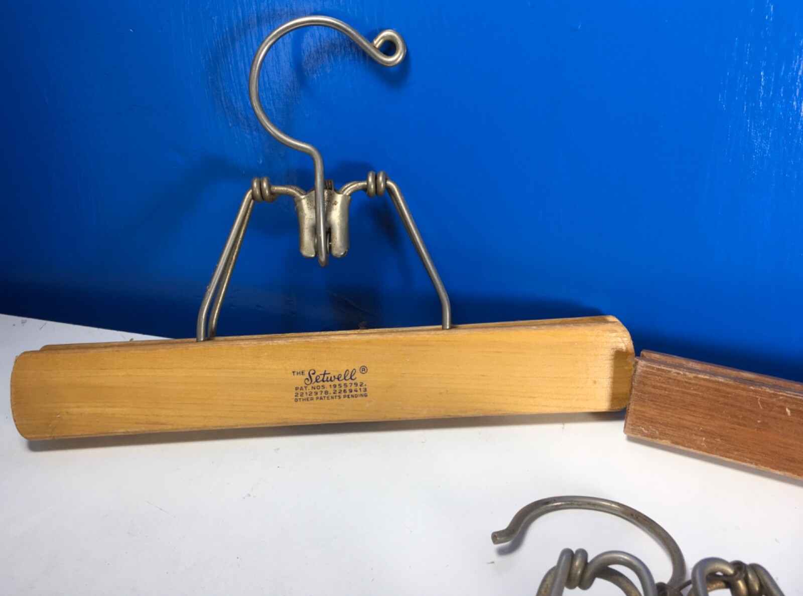 как выглядит 4 different ANTIQUE WOOD WIRE Clamp CLOTHES HANGERS Setwell Special фото