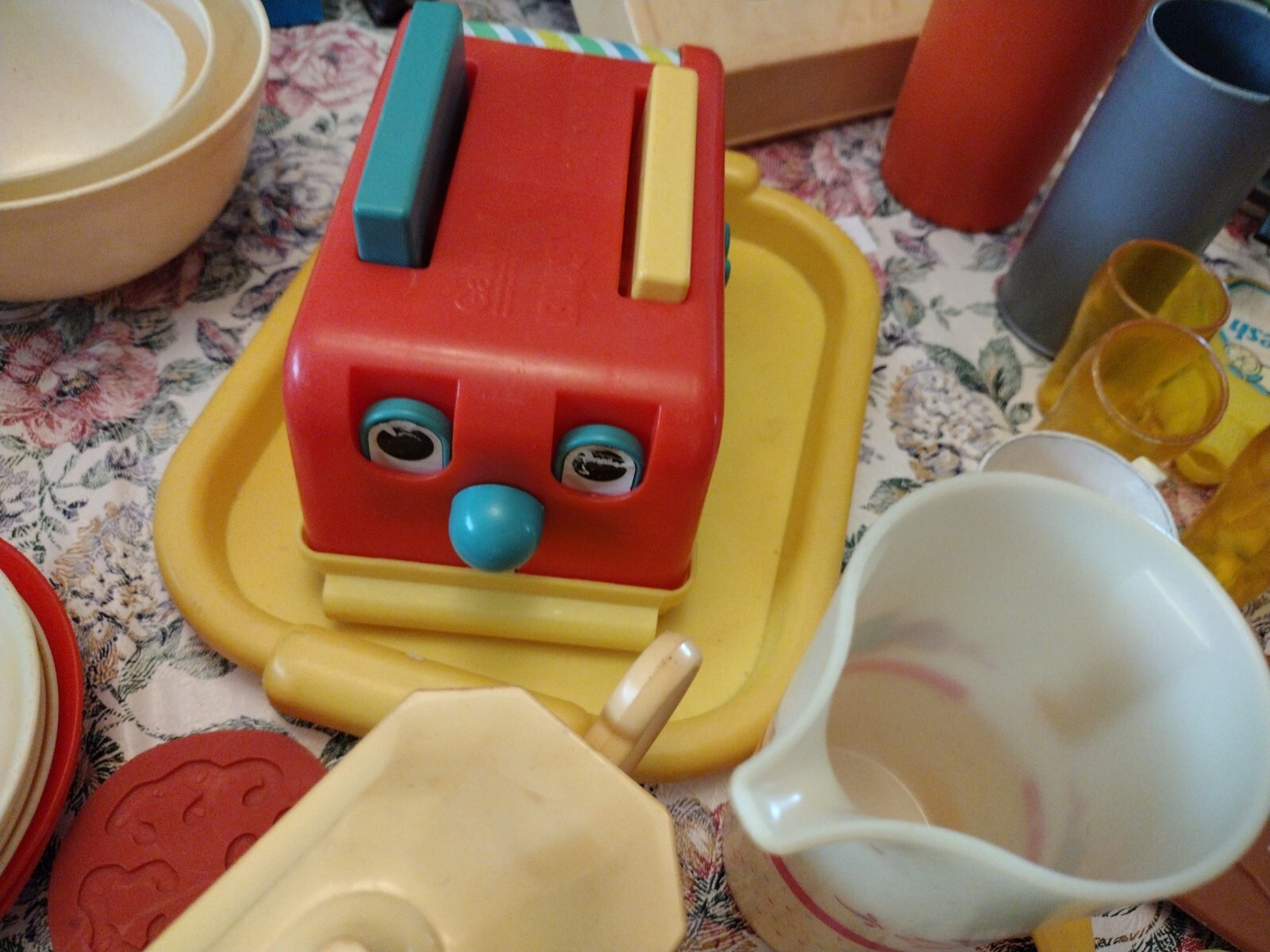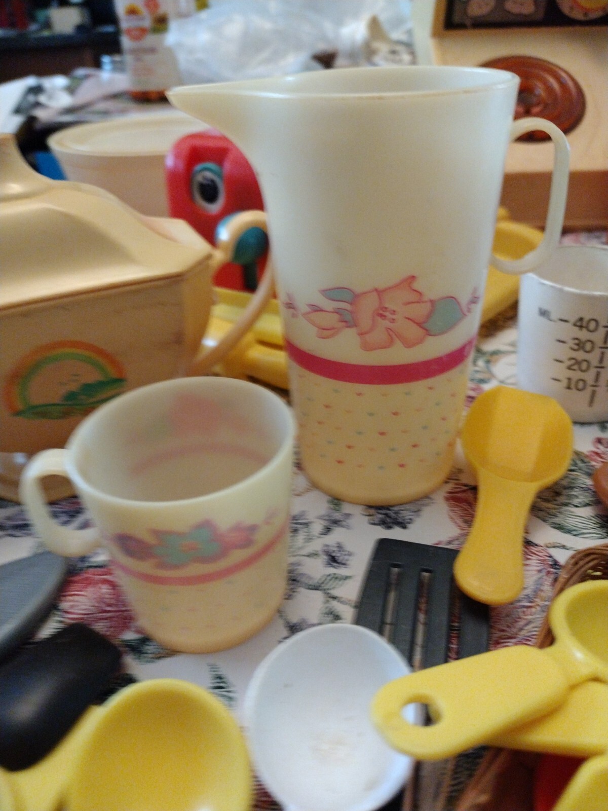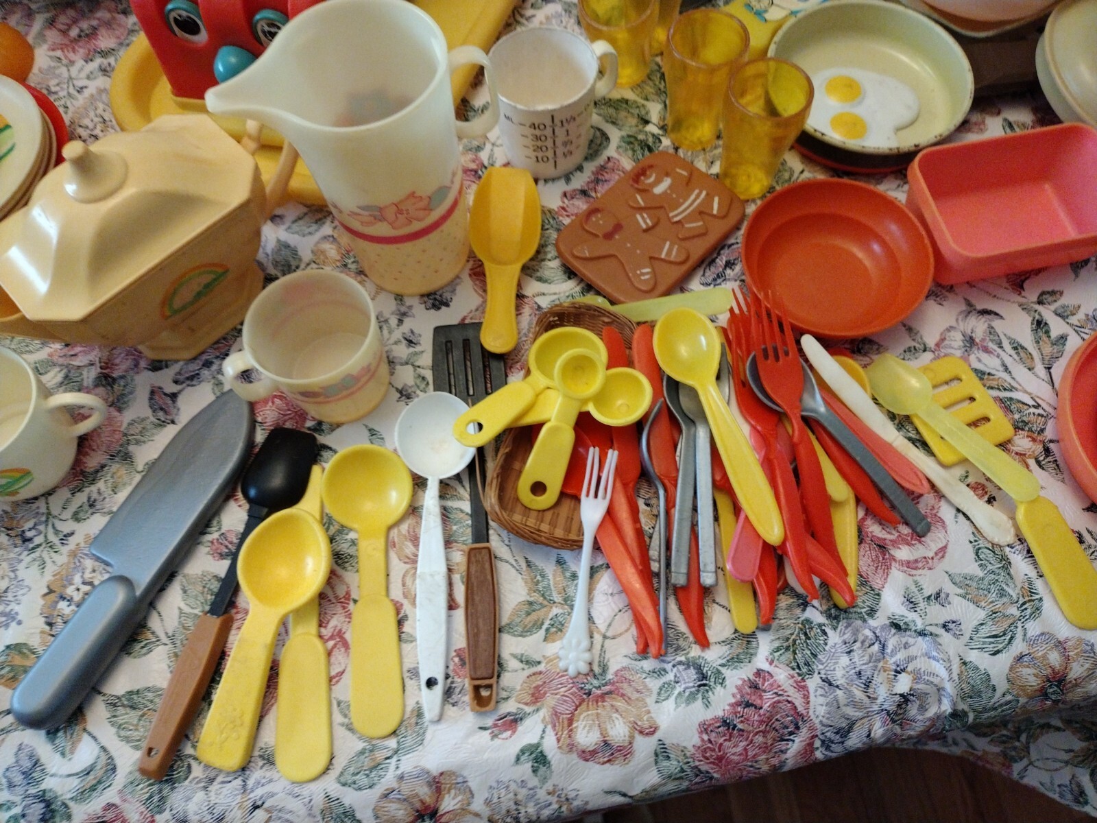 как выглядит VTG Lot Metal Aluminum Wood Plastic Child Kitchen Household Play Dishes Used фото