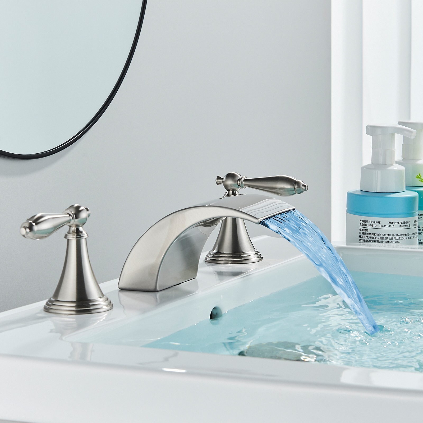 Widespread LED Waterfall Bathroom Sink Faucet 3-Hole Basin Mixer Brushed Nickel