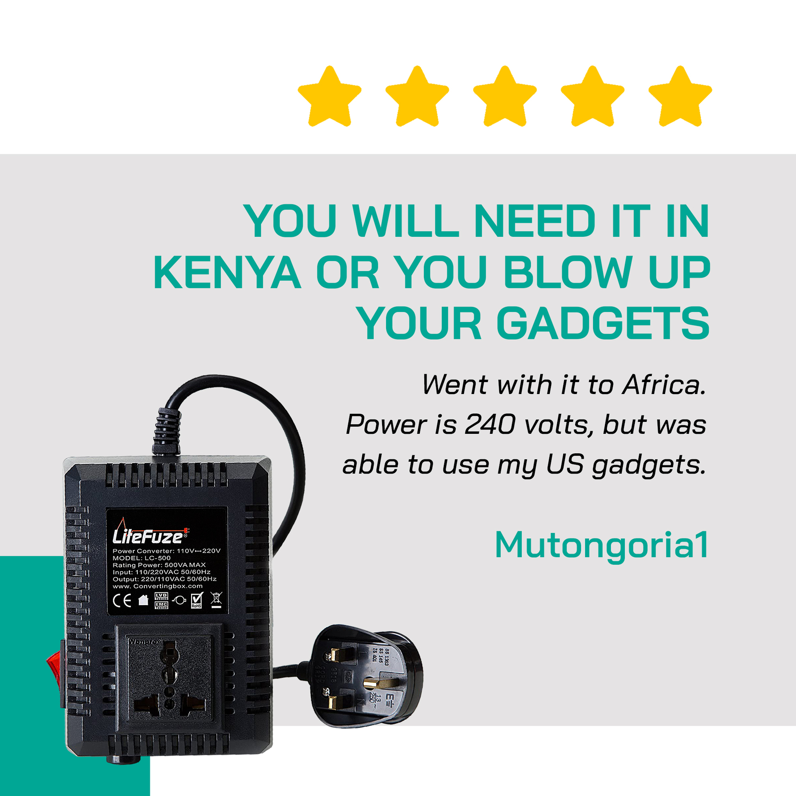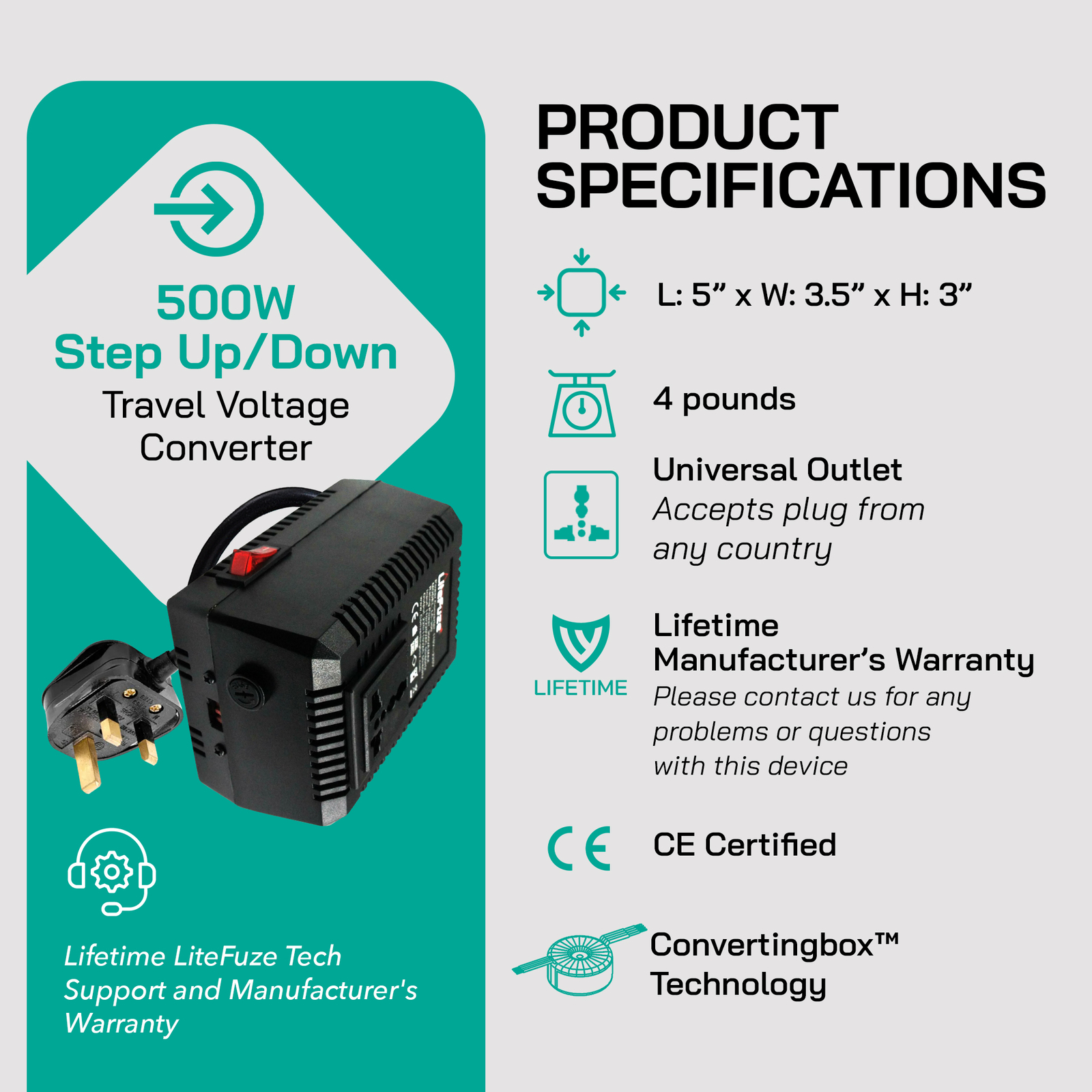 LiteFuze LC-500UK 500W Travel Voltage Converter Transformer - Step Up/Down - UK
