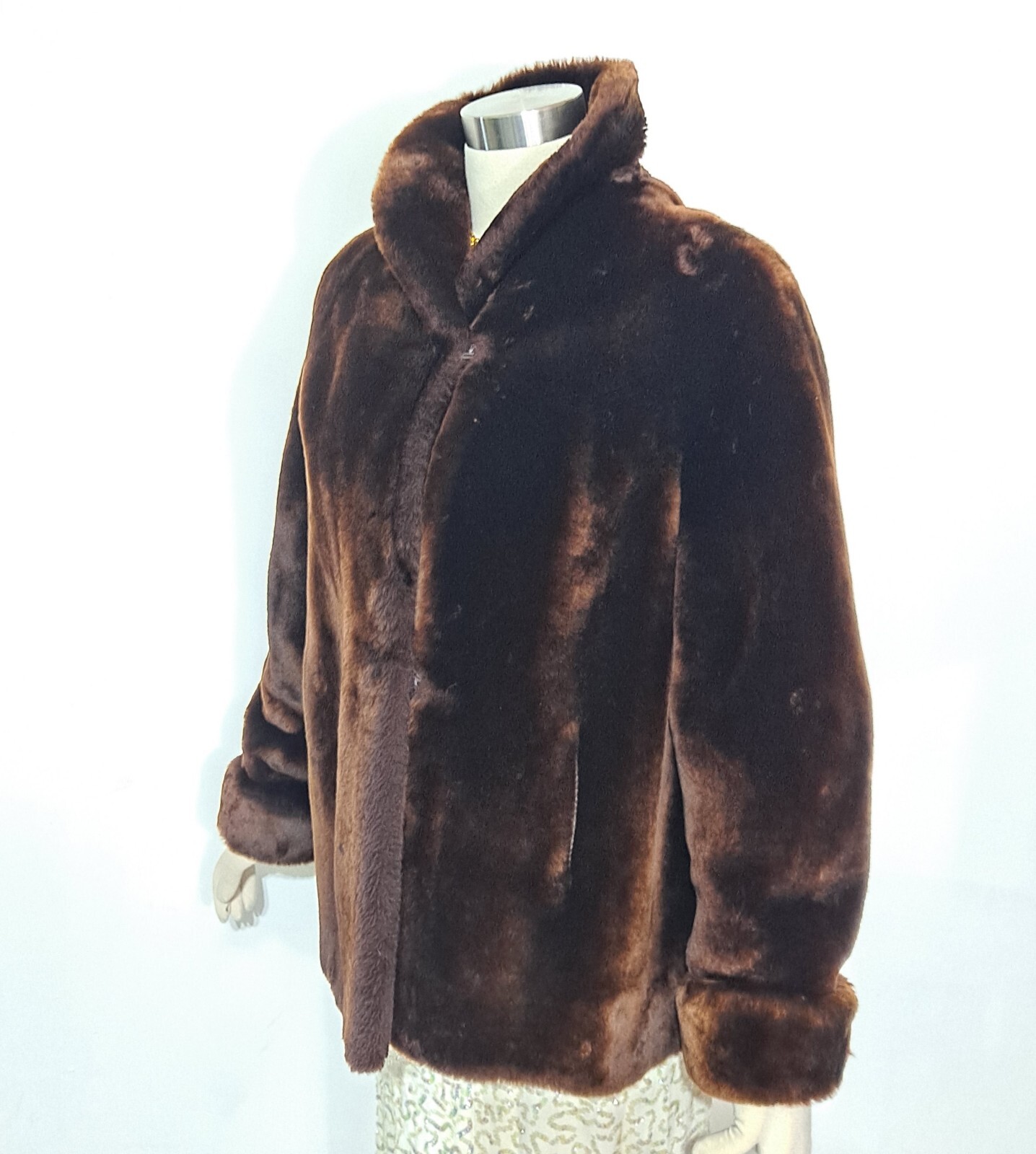 Vintage 1950s Mouton Shearling Faux Fur Coat Jacket Deep Brown Plush