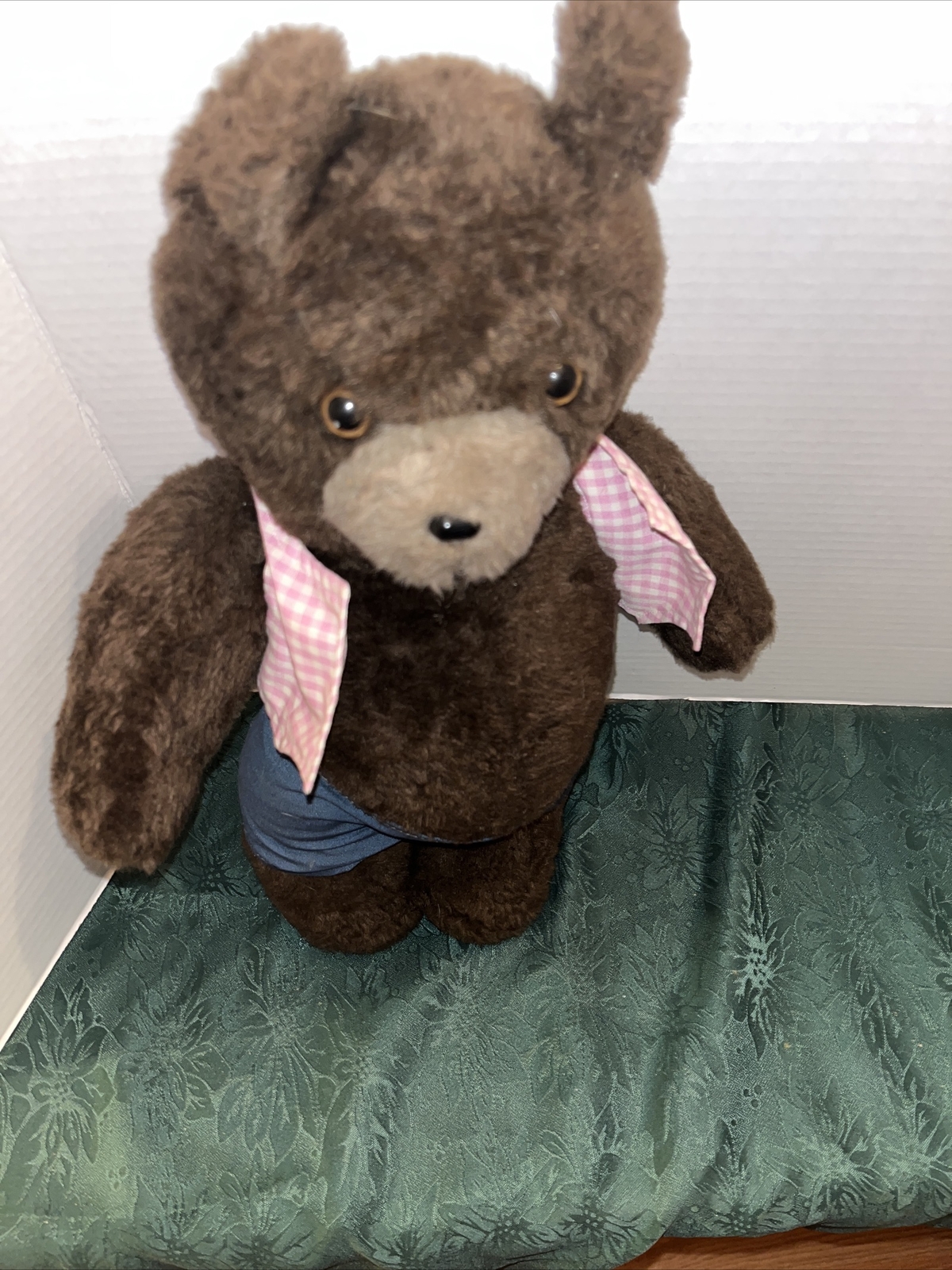 как выглядит RARE VINTAGE JOINTED PLUSH DOLL FIGURE BROWN TEDDY BEAR TOY CHECKERED SHIRT фото