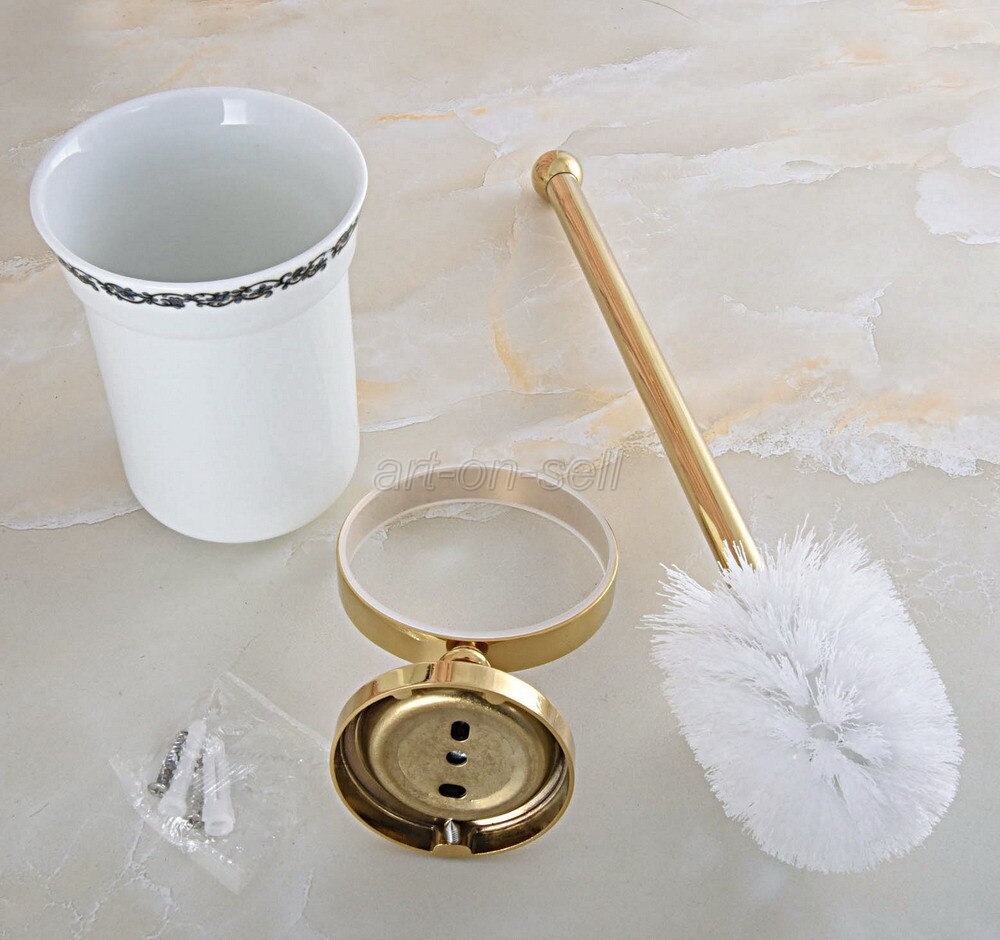 Gold Color Brass Toilet Brush Set Holder Brush Ceramic Cup Wall Mounted aba594