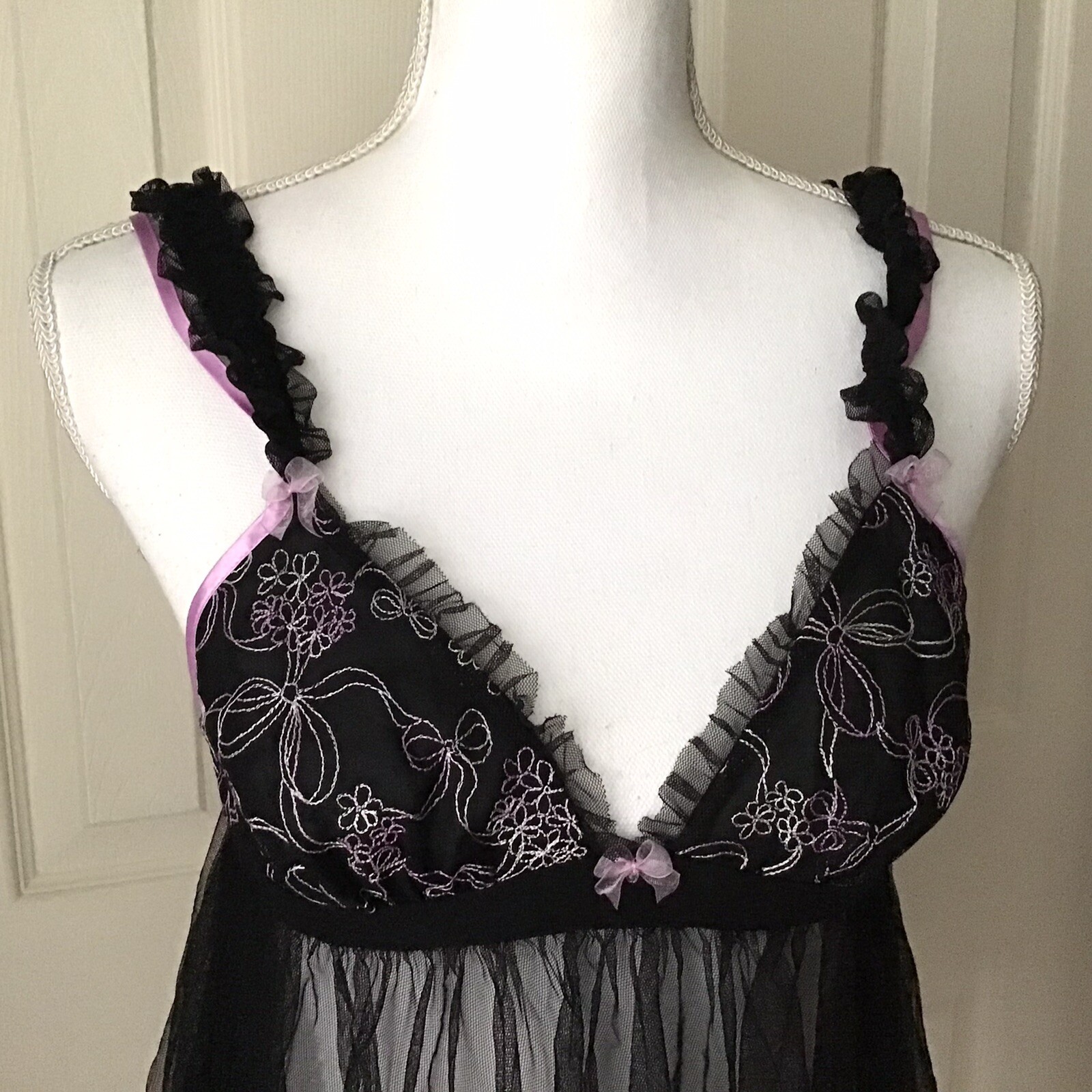 как выглядит Betsey Johnson Intimate Small Sheer Babydoll Black Pink Lingerie Nighty Ruffle фото