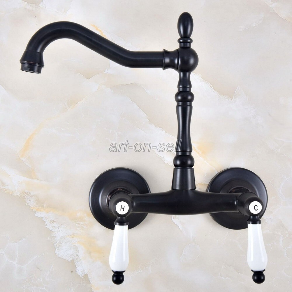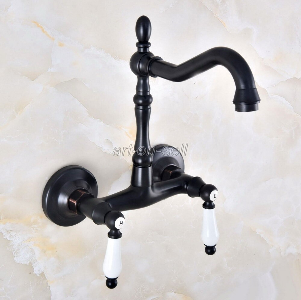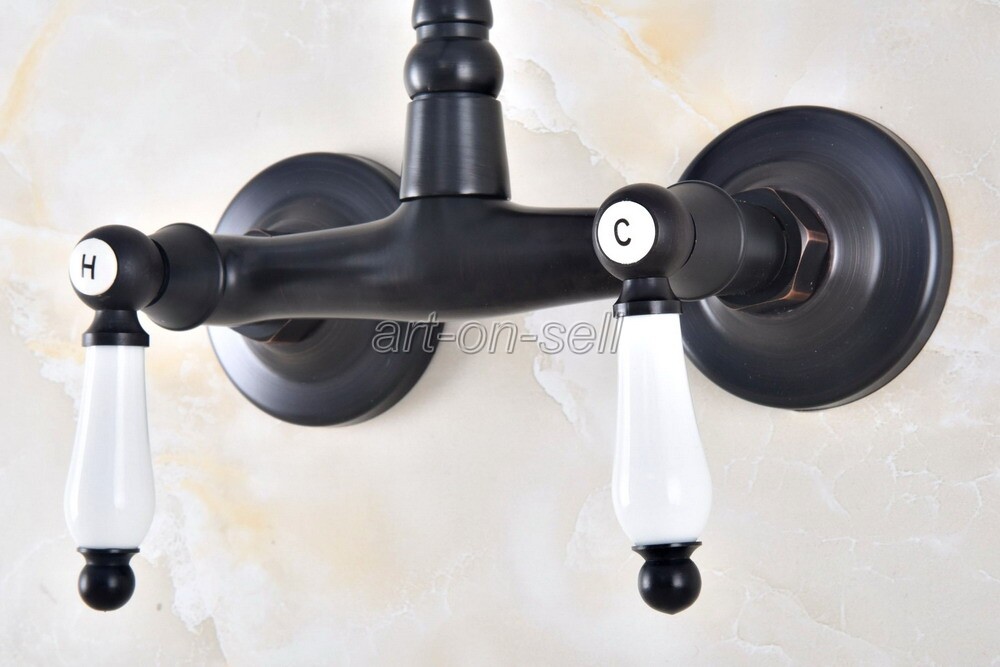 Oil Rubbed Bronze Bathroom Basin Sink Faucet Dual Handles Mixer Tap Wall Mount