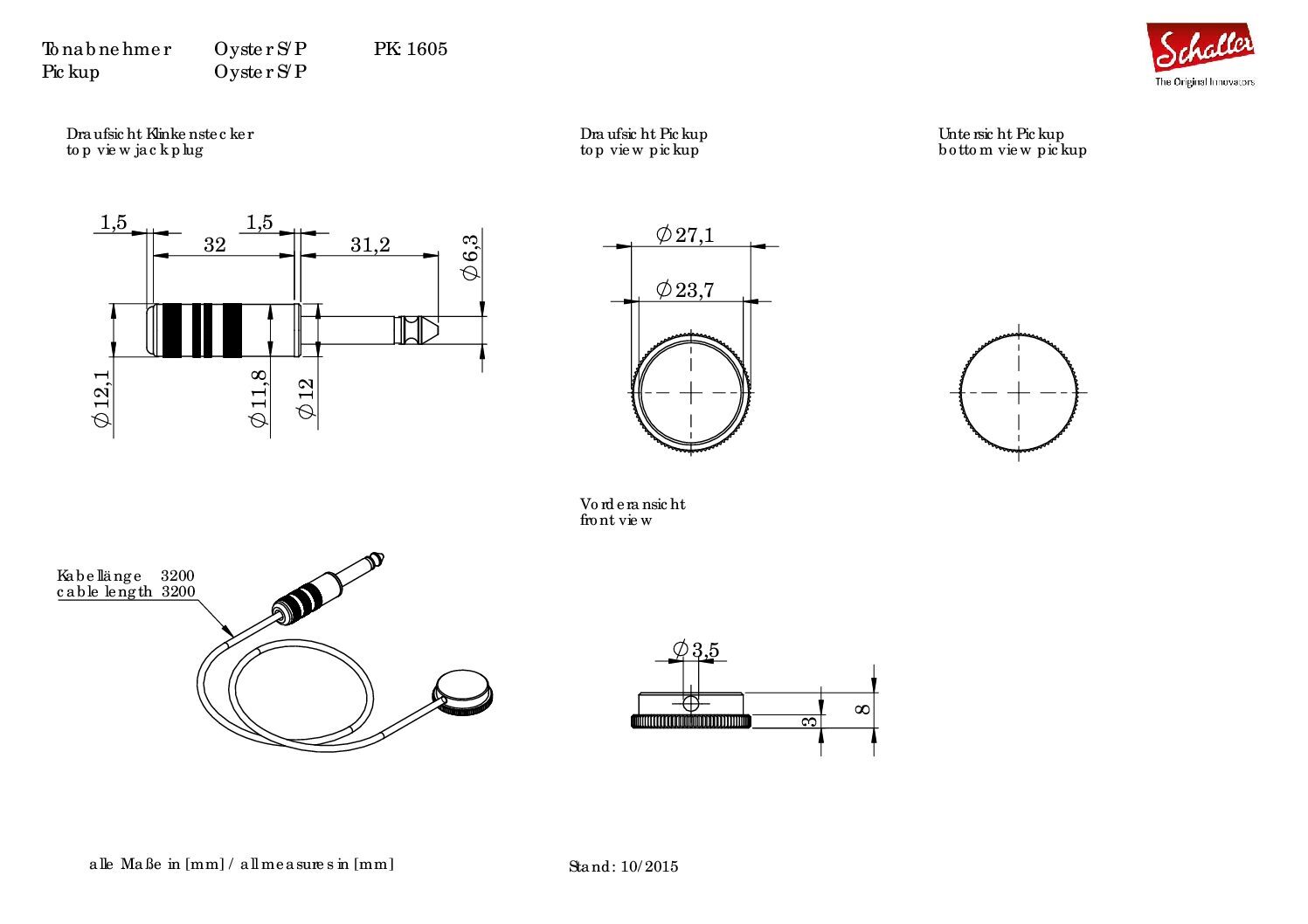 Schaller Oyster S/P Piezo Guitar Pickup With 1/4 Jack - Nickel