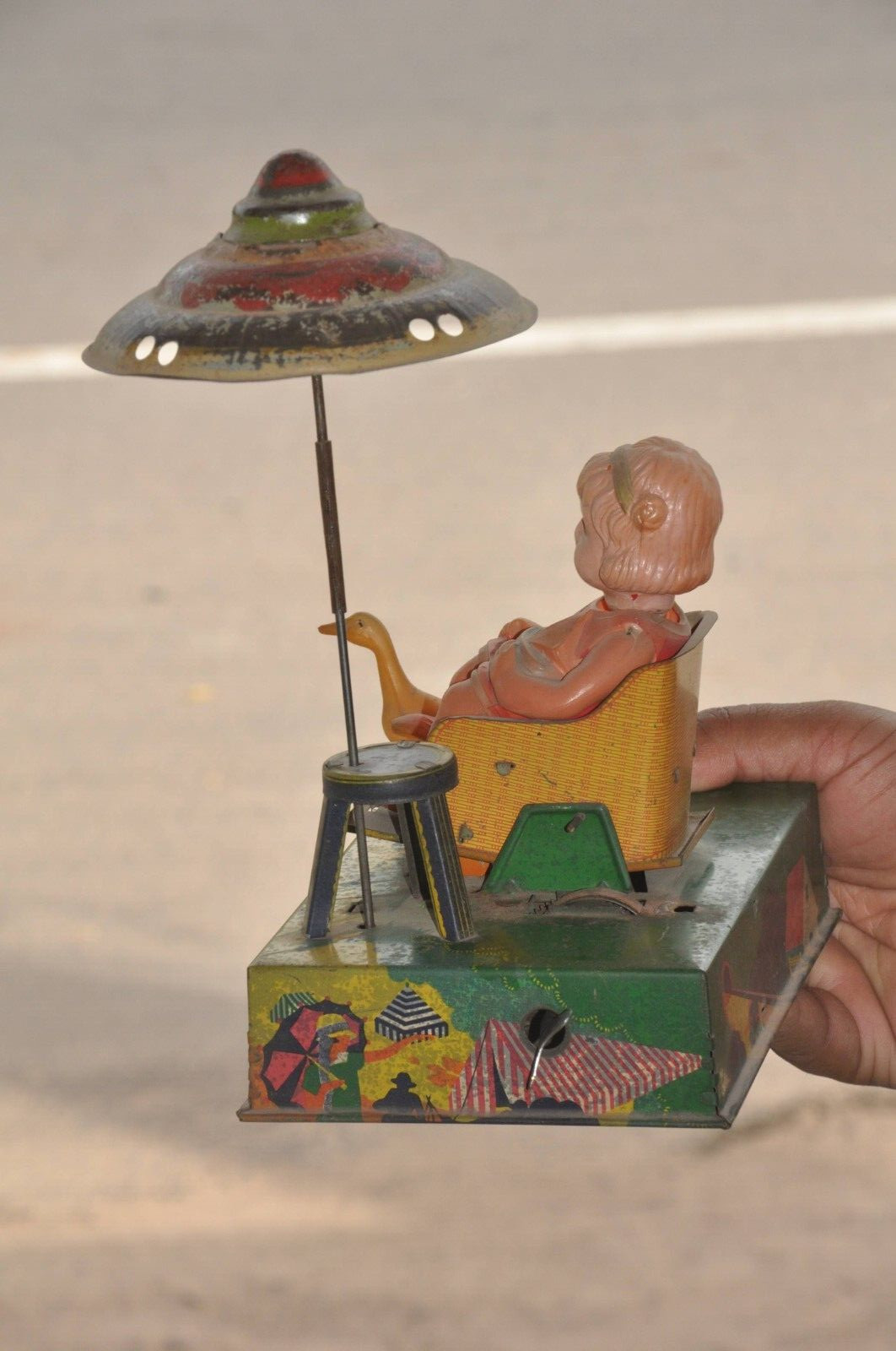 как выглядит Vintage Colorful Wind Up Girl Duck Litho C.K Trademark Tin Toy, Japan фото