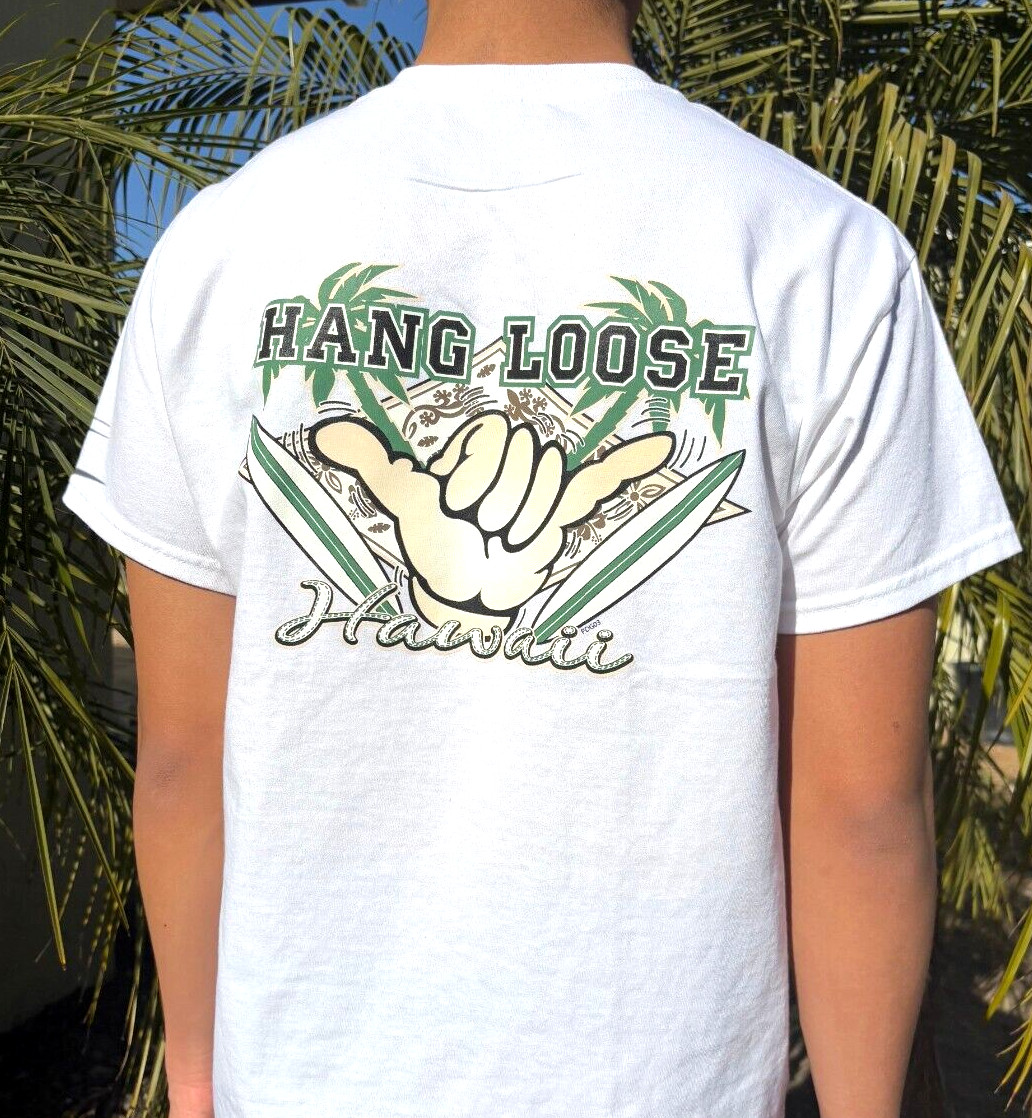 Hawaiian Style Island Hang Loose Shaka Surfboard Men Women White Cotton T-shirt