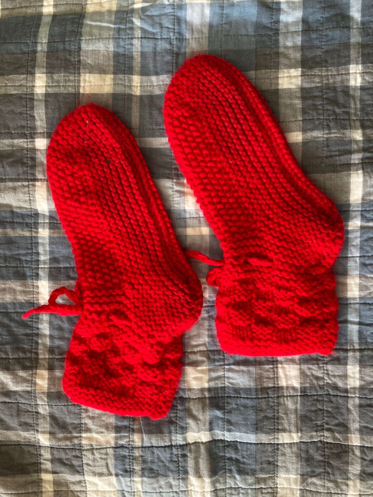 как выглядит Hand Knitted Unisex Red Bootie Socks, Vintage, Slightly Worn фото