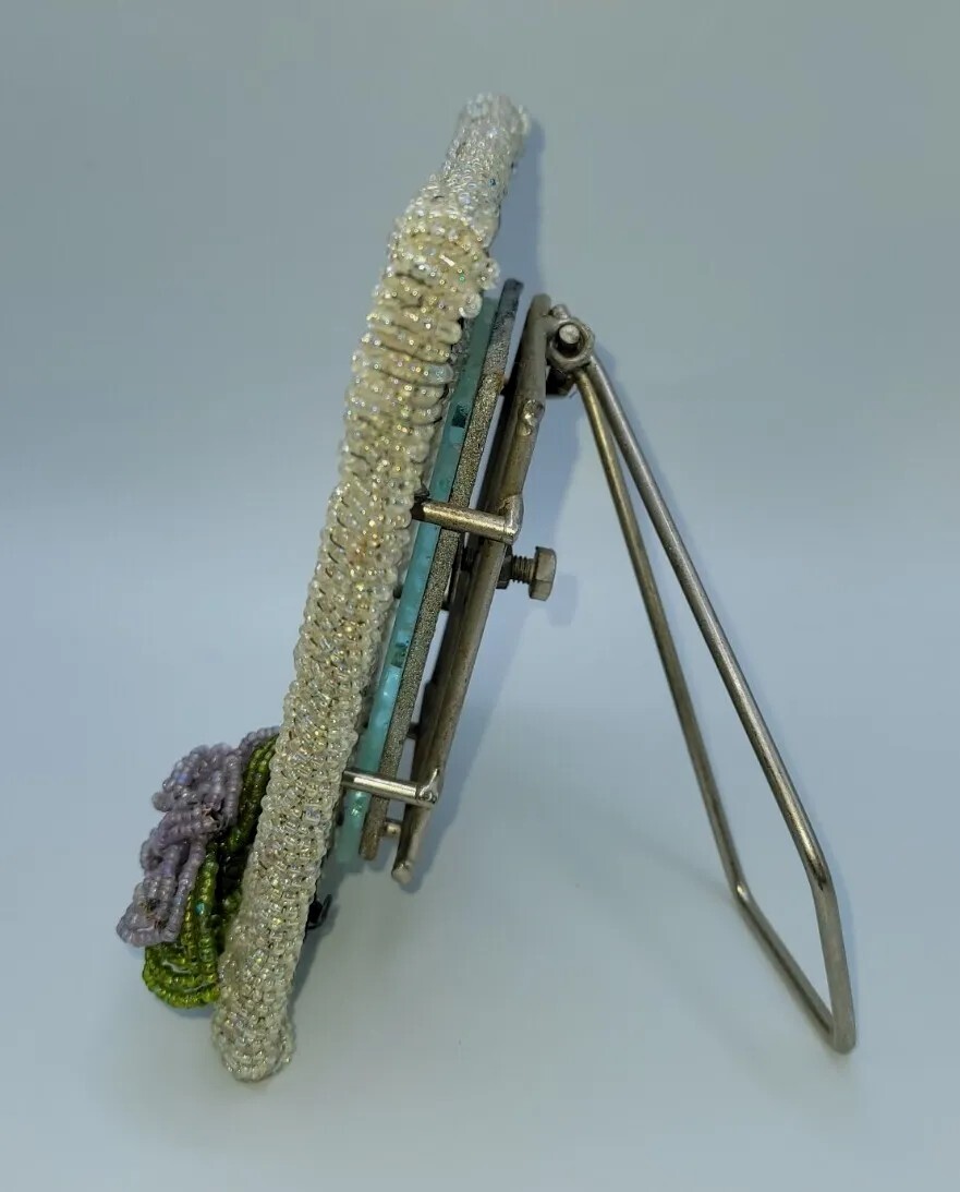 Vintage Champagne Beaded Picture Frame Amethyst Beaded Flower Metal Back 2X3