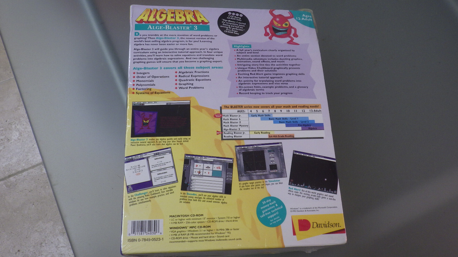 как выглядит Vtg 1995 Davidson PC Software FACTORY SEALED Big Box ALGE-BLASTER 3 Windows Mac фото