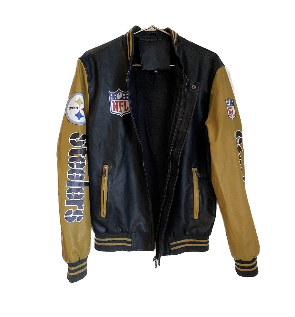 • NFL Steelers Faux Leather Vinyl Letterman Varsity Bomber Jacket