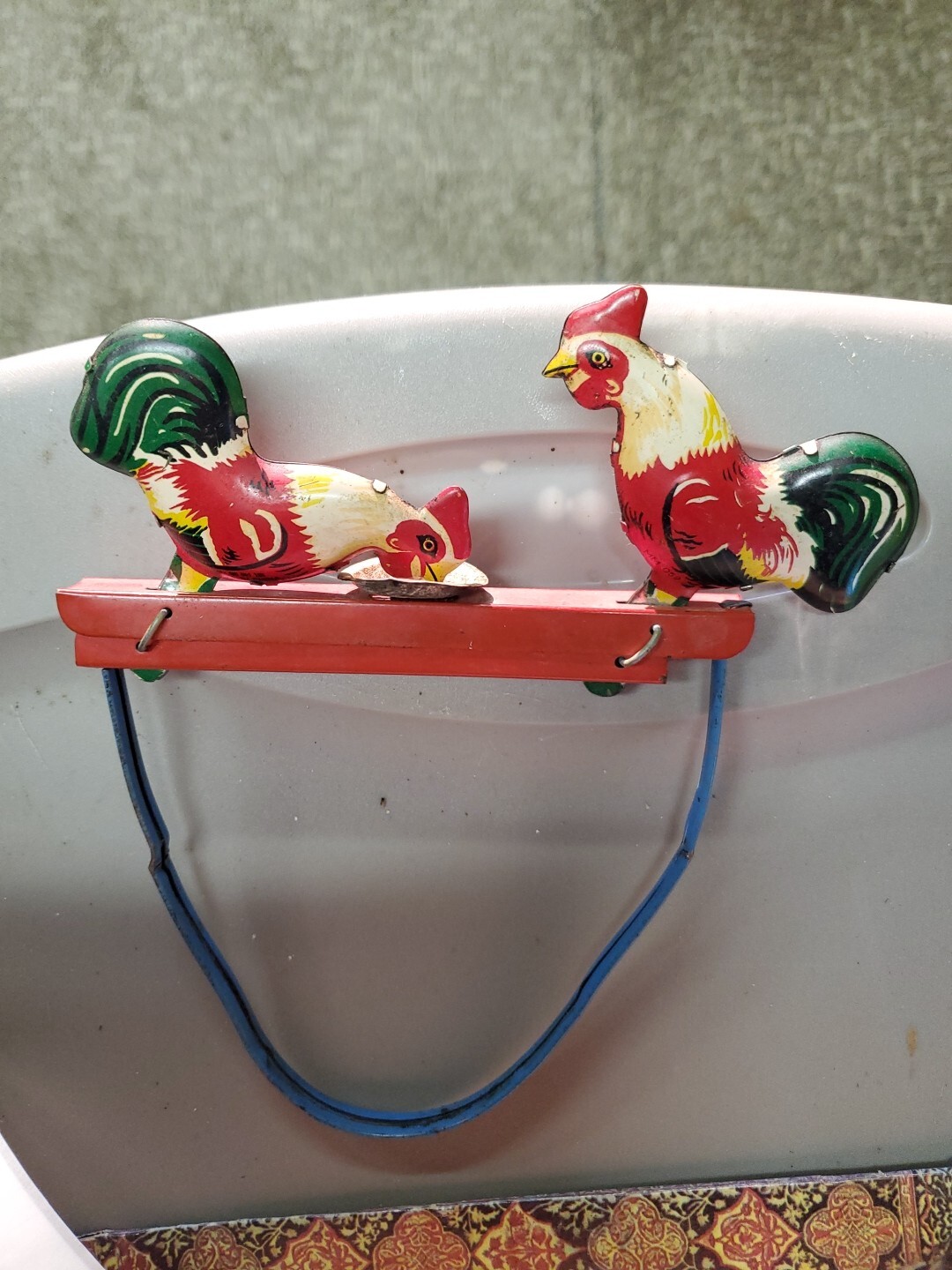 как выглядит Vintage Tin Litho Toy Roosters Hand Squeezed Mechanical Pecking Food Dish Works фото