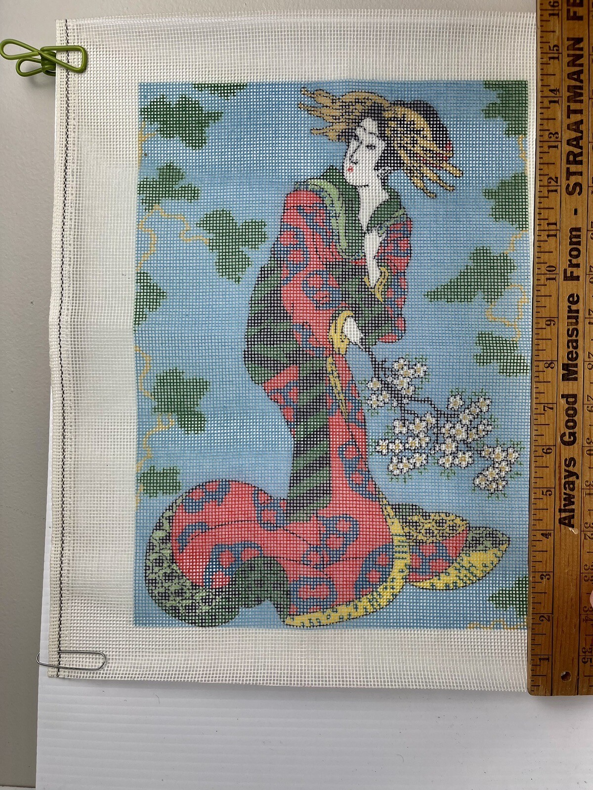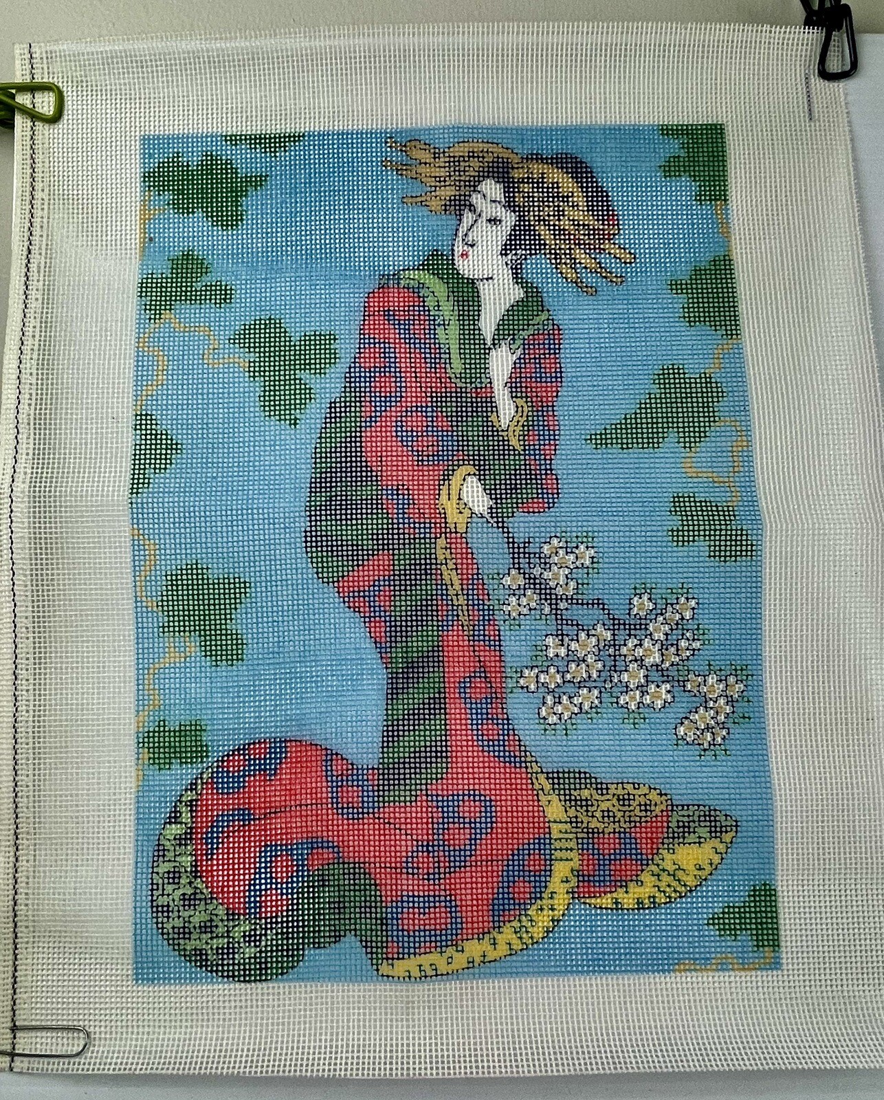 Needlepoint Asian Japanese Woman Floral Kimono On Crafting Canvas New Vintage