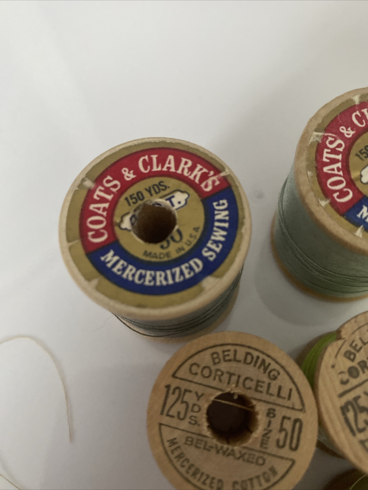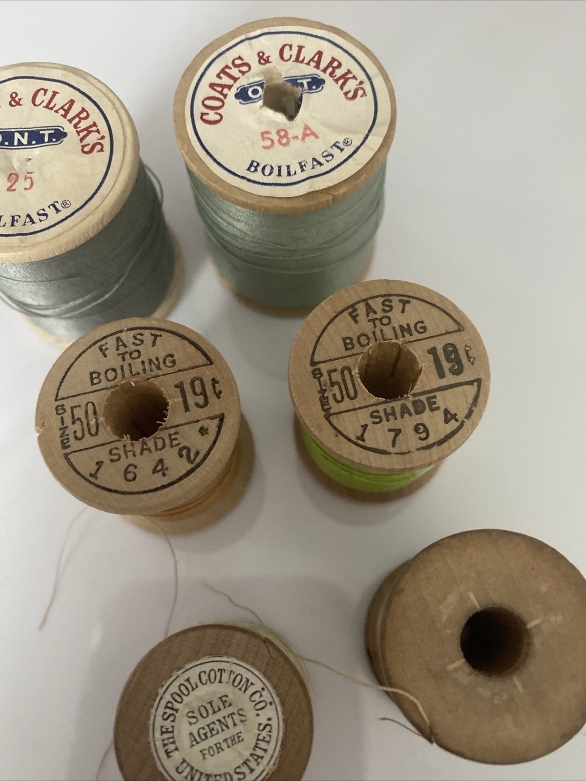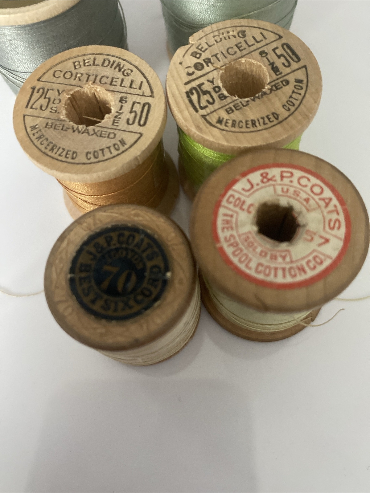 6 Vintage Wooden Spools Of Sewing Thread Corticelli Coats Clark J P Coats