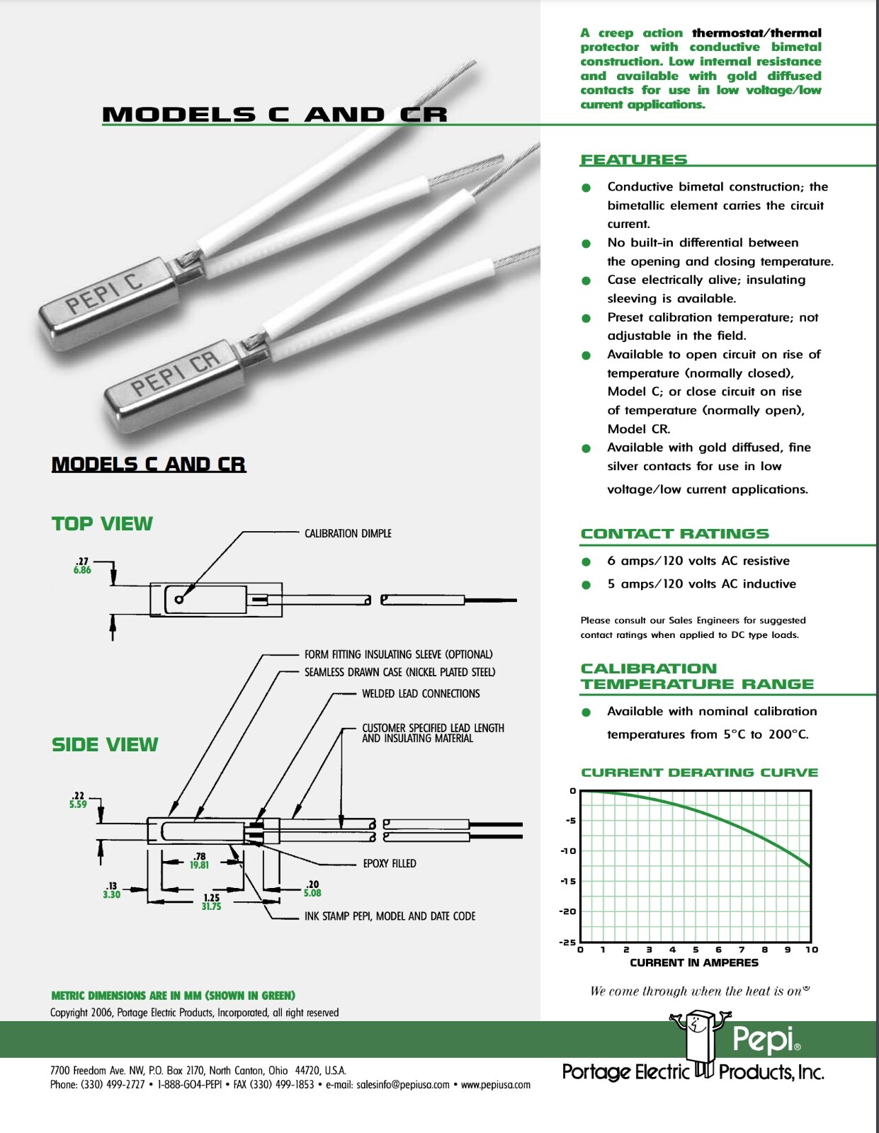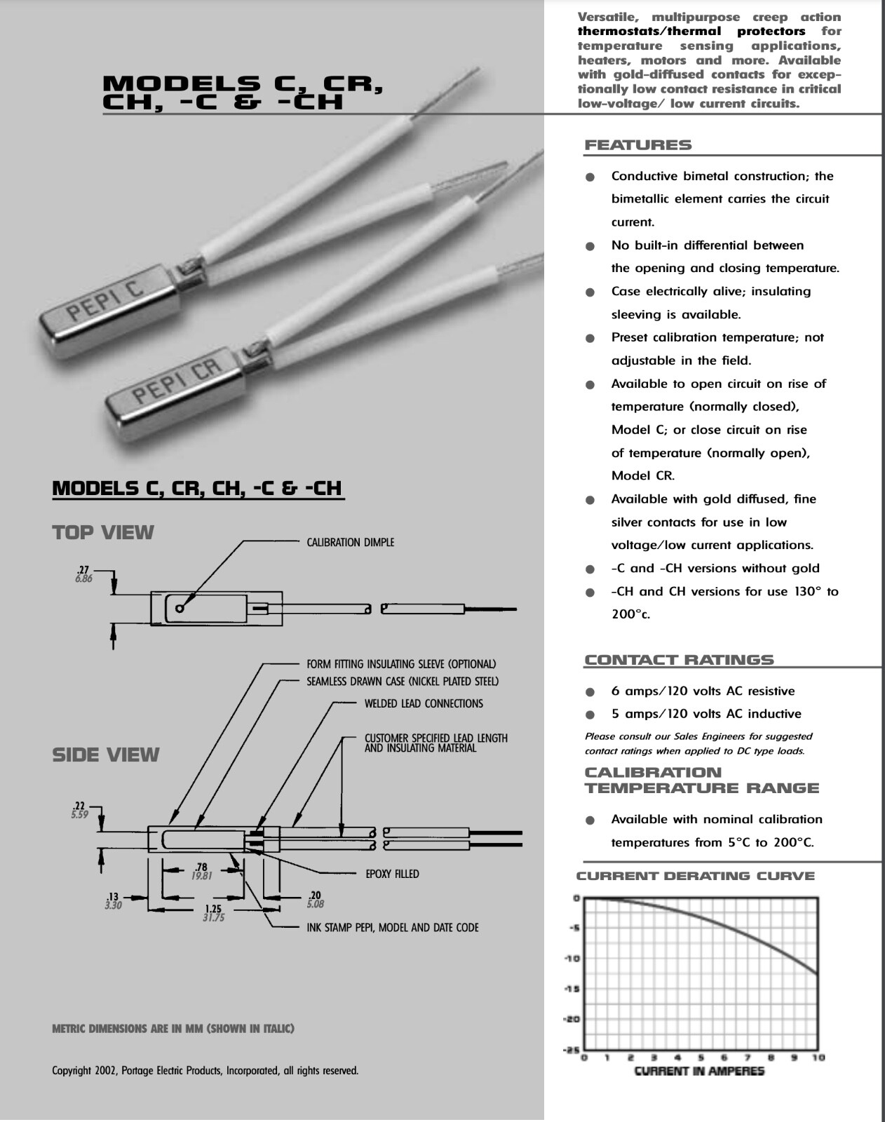 Pepi -CH 200C Thermal Protector, Normal Closed, Thermostat Switch, 6A, 120VAC