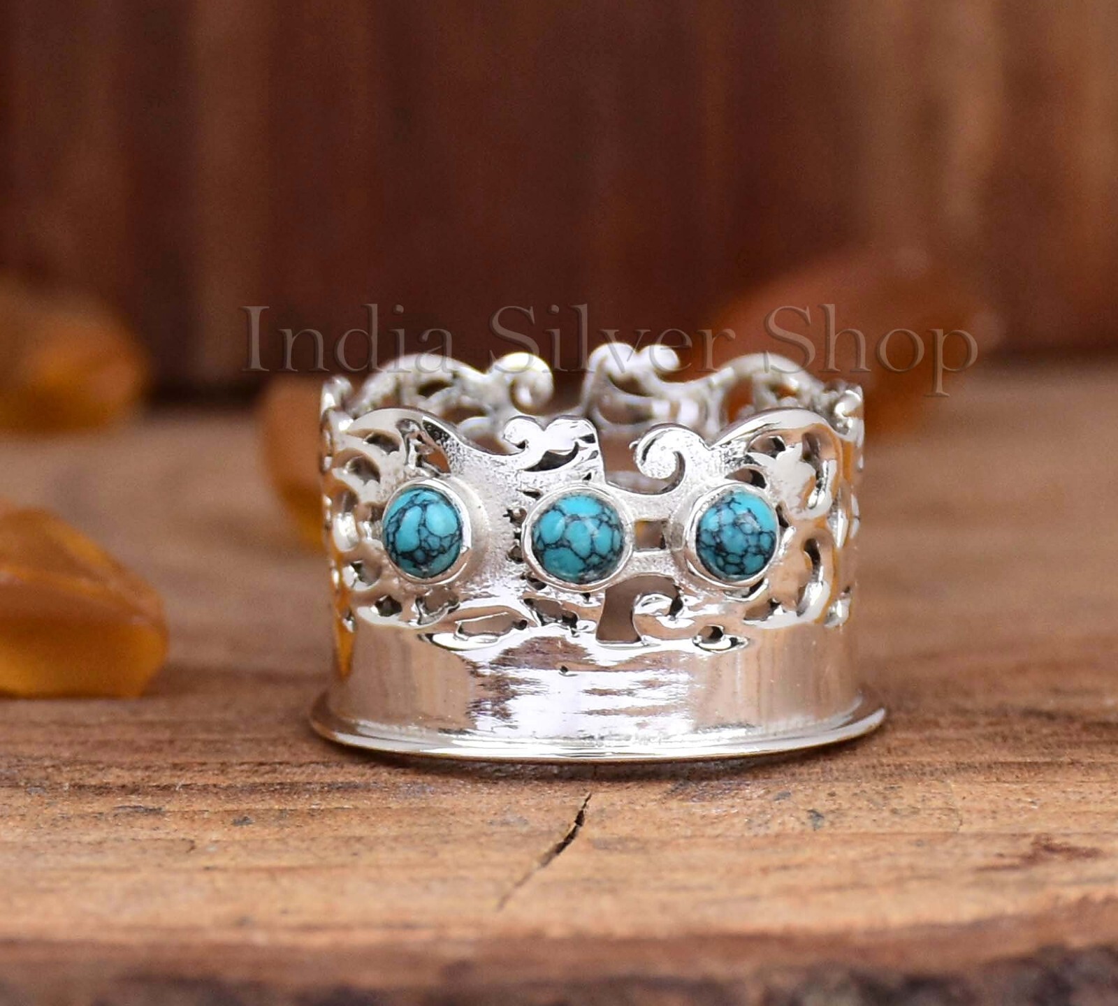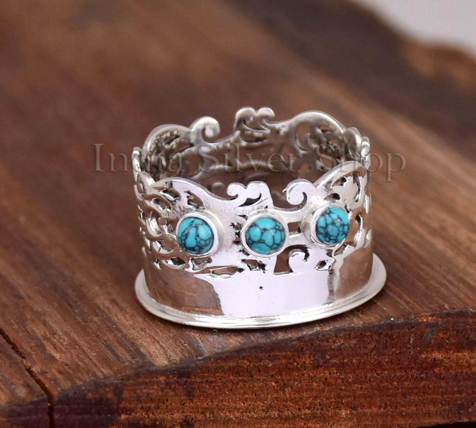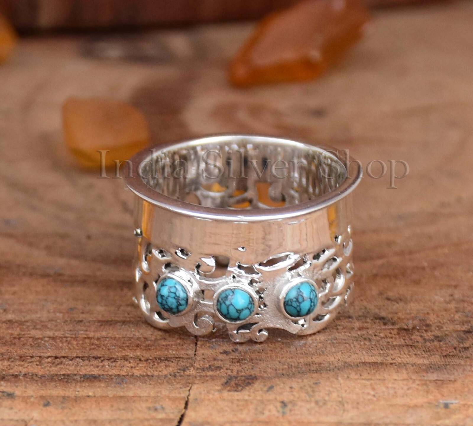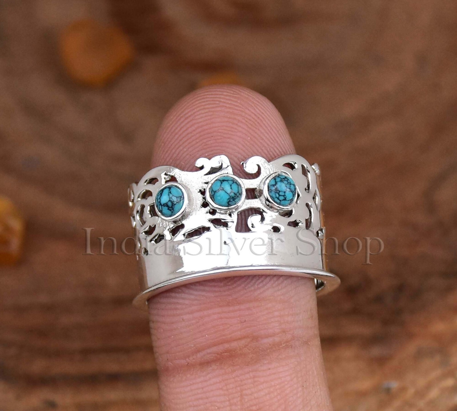 Designer Boho Wide Band Turquoise Ring 925 Sterling Silver Ring For Her