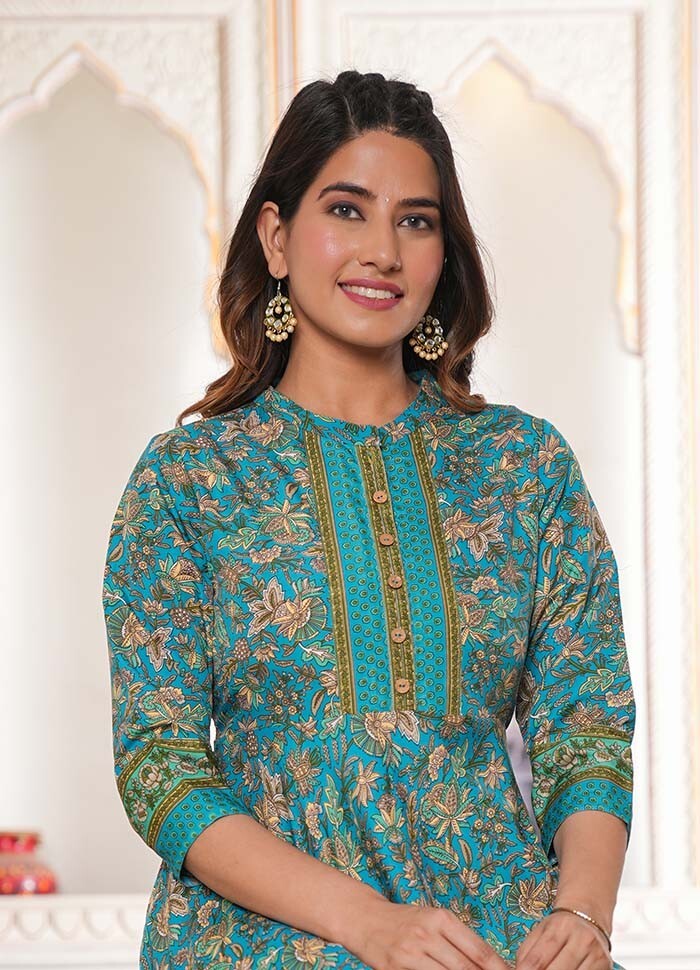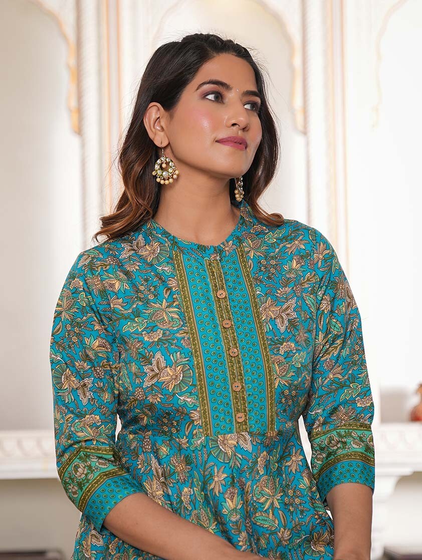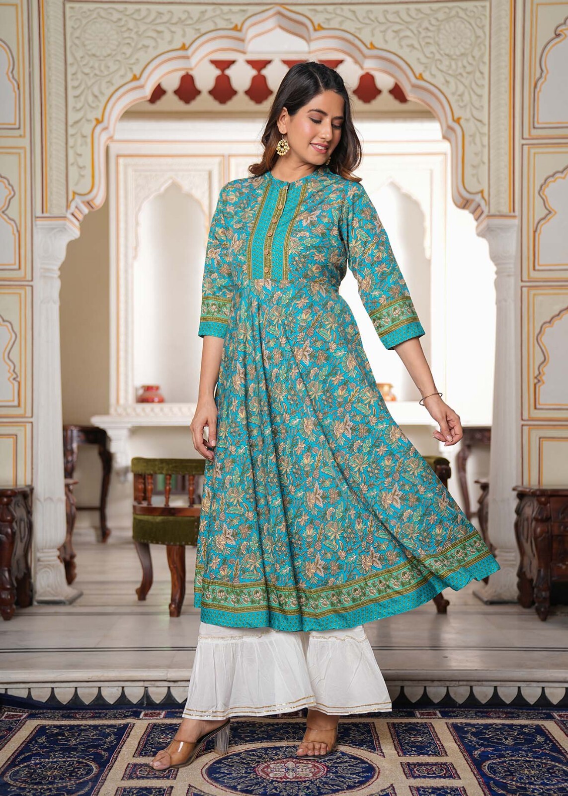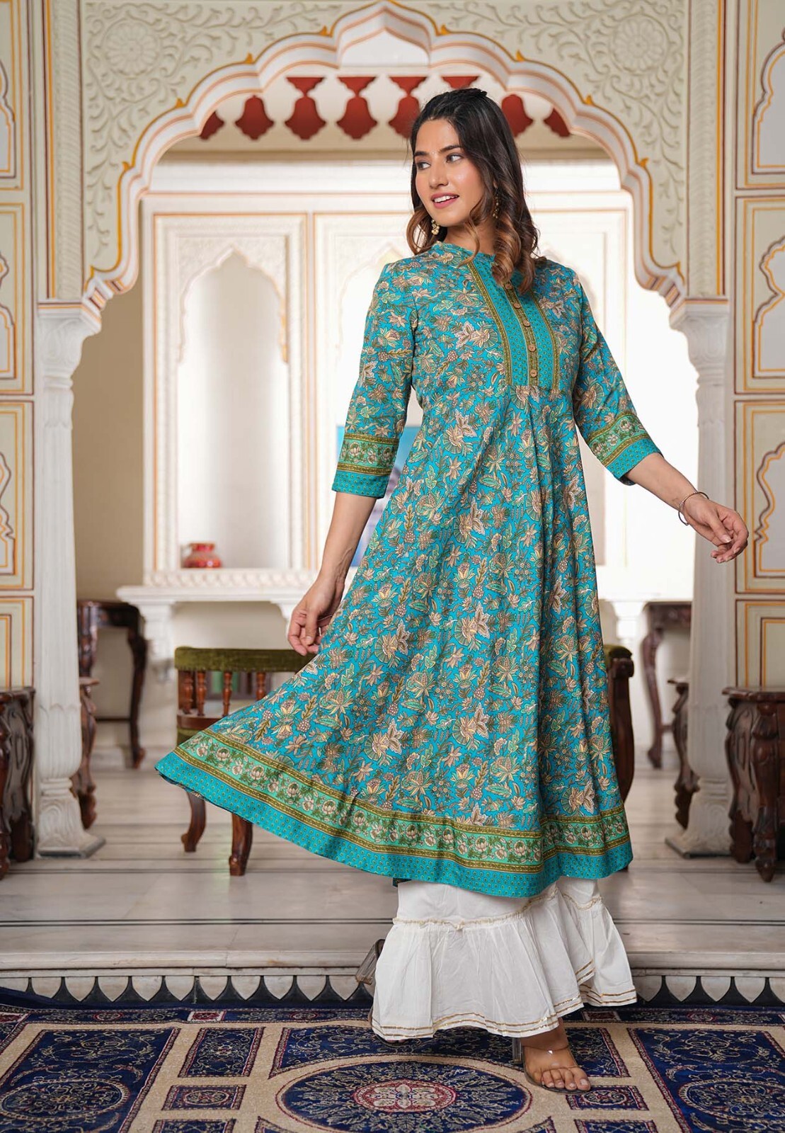 YASH GALLERY Women's Floral Printed Anarkali Kurti, Elegant Green Dress,