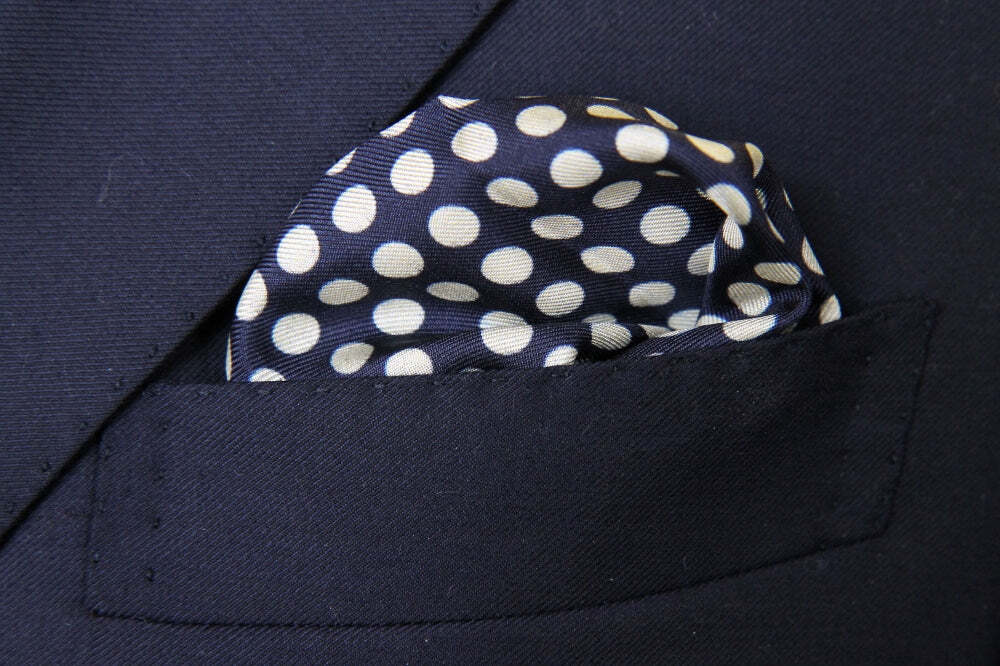 Battisti Pocket Square SALE : Grey with cream dot on navy, pure silk