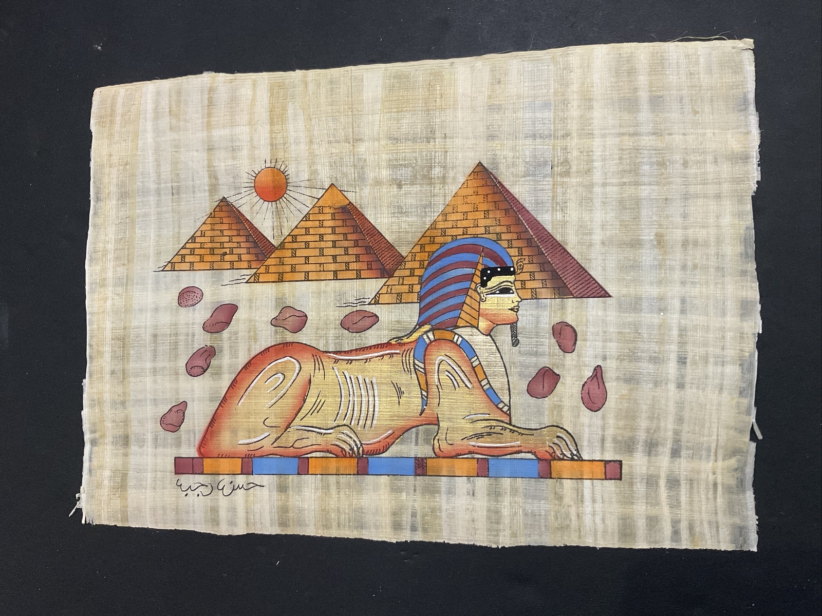 • Vintage Egyptian Papyrus Painting Sphinx and pyramids 9x13